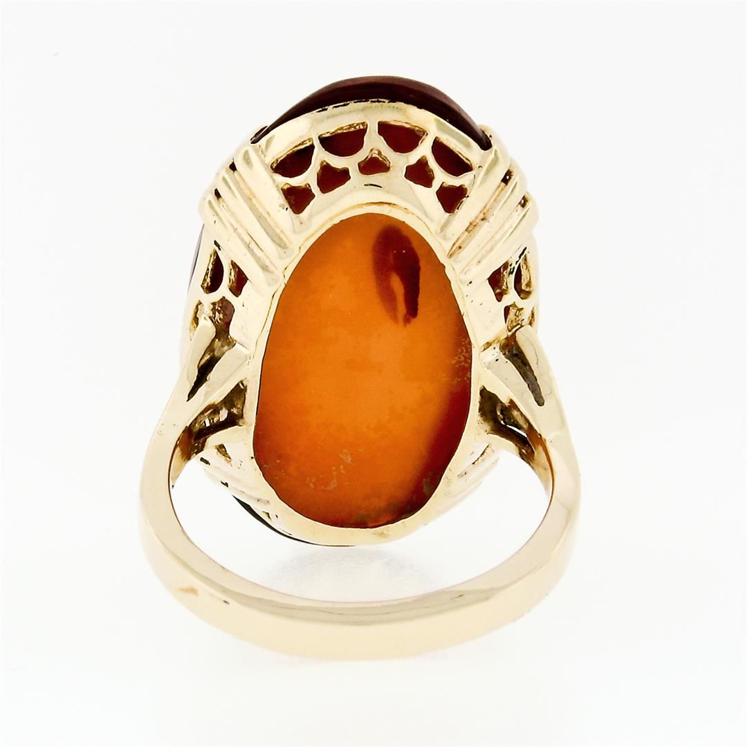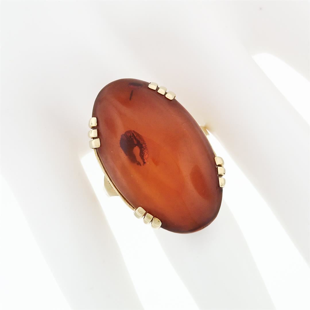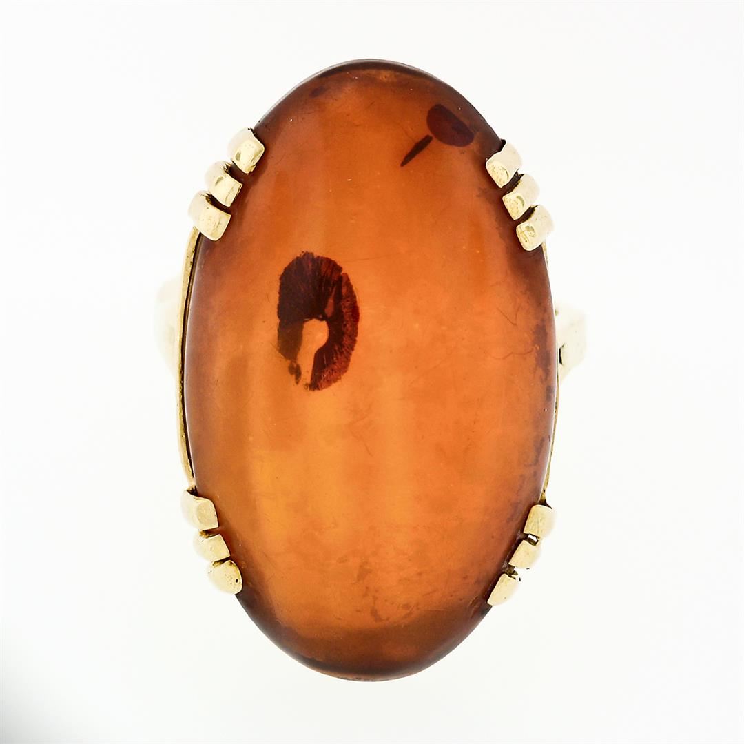A vintage solid 14k yellow gold statement ring with 1 large oval cabochon cut natural amber (30.5x18.1mm). The ring is size 9.5, weighs a total of 8.96 grams, and measures 30.5mm wide.