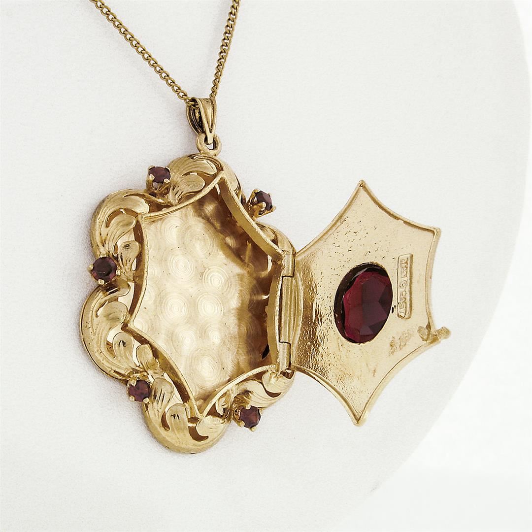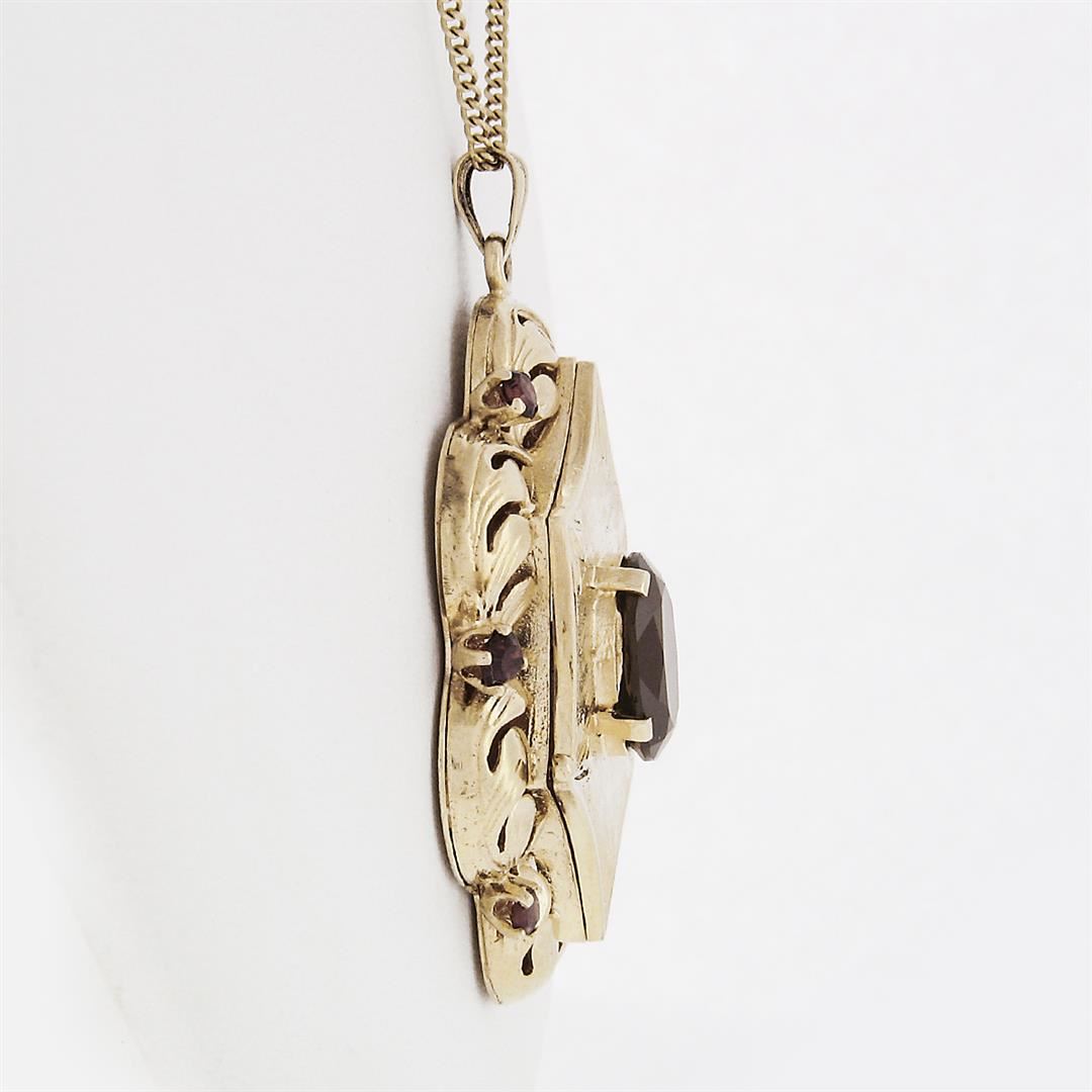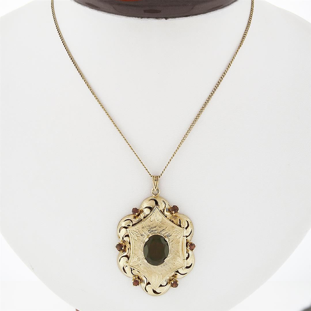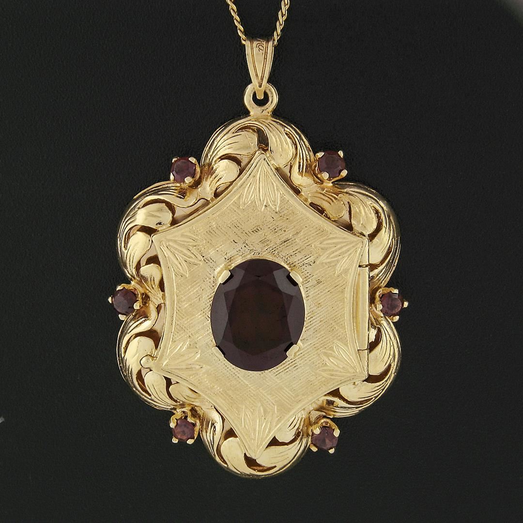 A vintage soldi 14k yellow gold large pendant necklace, with 1 oval cut natural garnet (12.0x10.0mm - 3.74ct), & 6 round cut natural garnets (3.17mm- 0.60ctw). 18 inch curb link chain, 17.65 grams total weight, pendant measures 49.18x32.75mm.