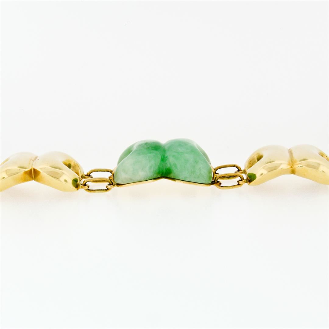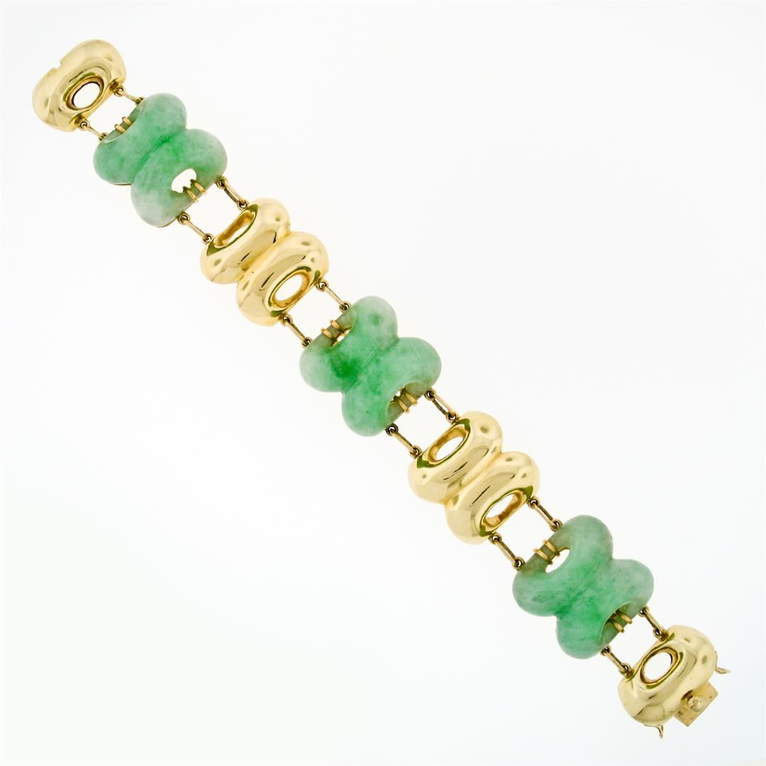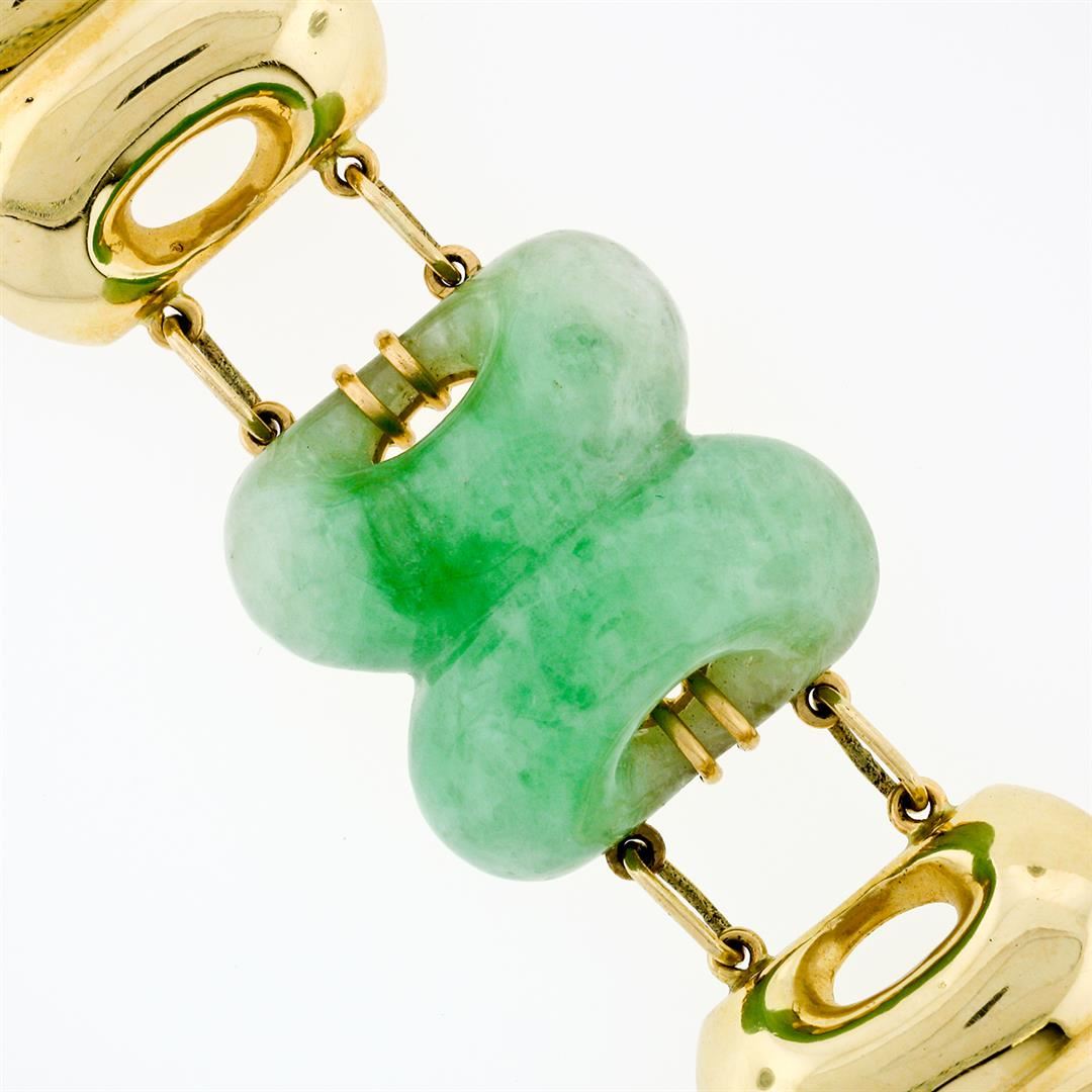 A vintage solid 14k yellow gold link bracelet with 3 custom pierced dual ring shaped natural jades (24.43x24.80mm) of a marbled green color. It weighs a total of 66.30 grams, measures 10.0mm wide, and measures 7 1/4 inches in length.