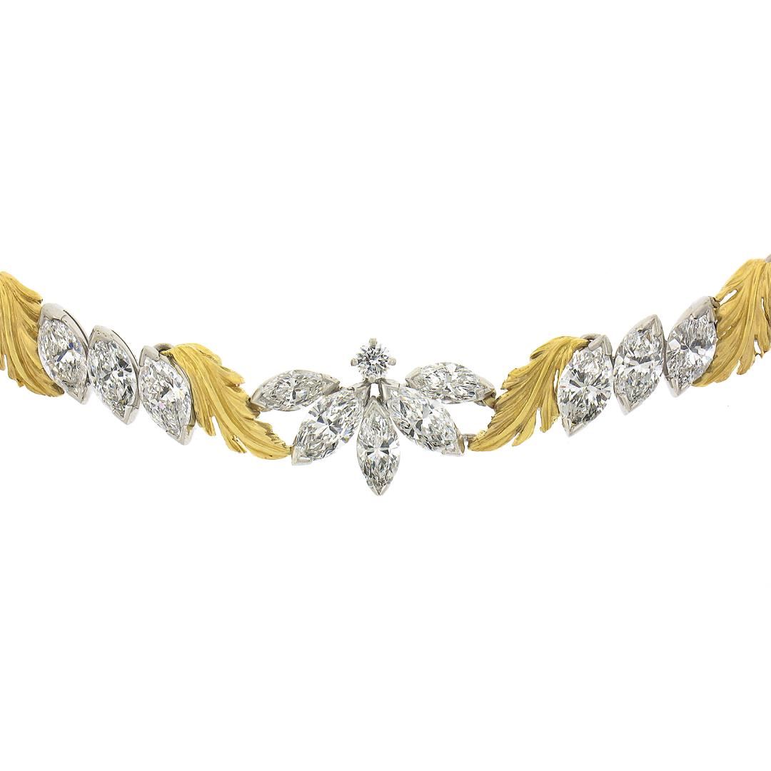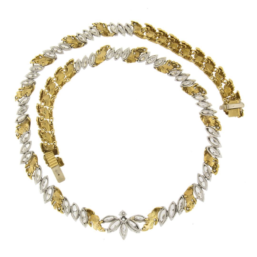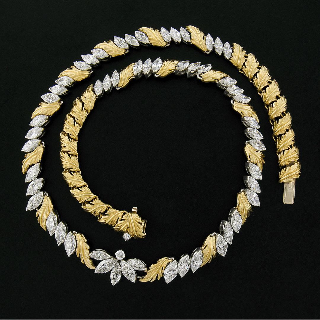 A vintage solid platinum & 18k yellow gold leaf link necklace by McTeigue & Co. , featuring 53 marquise cut natural diamonds (E-G - VVS2-VS2 ; 14ctw), and 2 round cut natural diamonds (F/G - VS1/VS2 ; 0.15ctw). It weighs a total of 49.97 grams, measures 13.2mm wide, and measures 16 inches in length.
