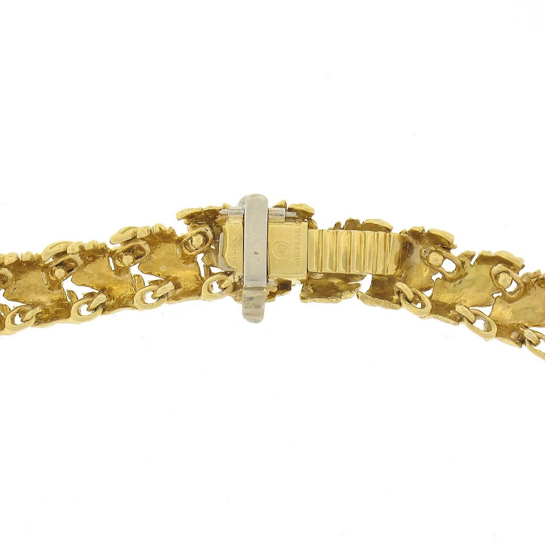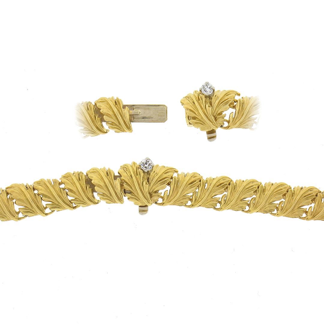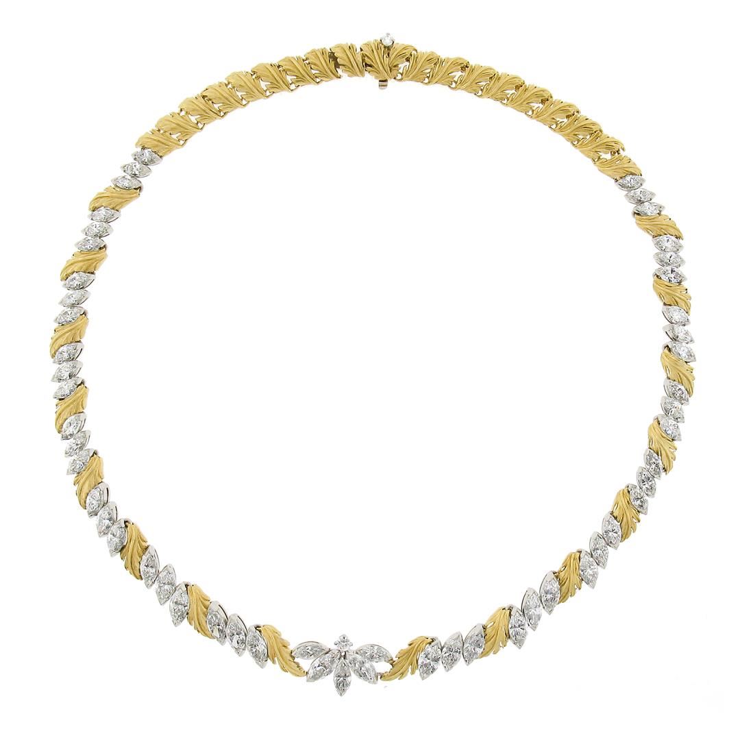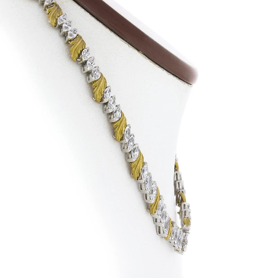 A vintage solid platinum & 18k yellow gold leaf link necklace by McTeigue & Co. , featuring 53 marquise cut natural diamonds (E-G - VVS2-VS2 ; 14ctw), and 2 round cut natural diamonds (F/G - VS1/VS2 ; 0.15ctw). It weighs a total of 49.97 grams, measures 13.2mm wide, and measures 16 inches in length.