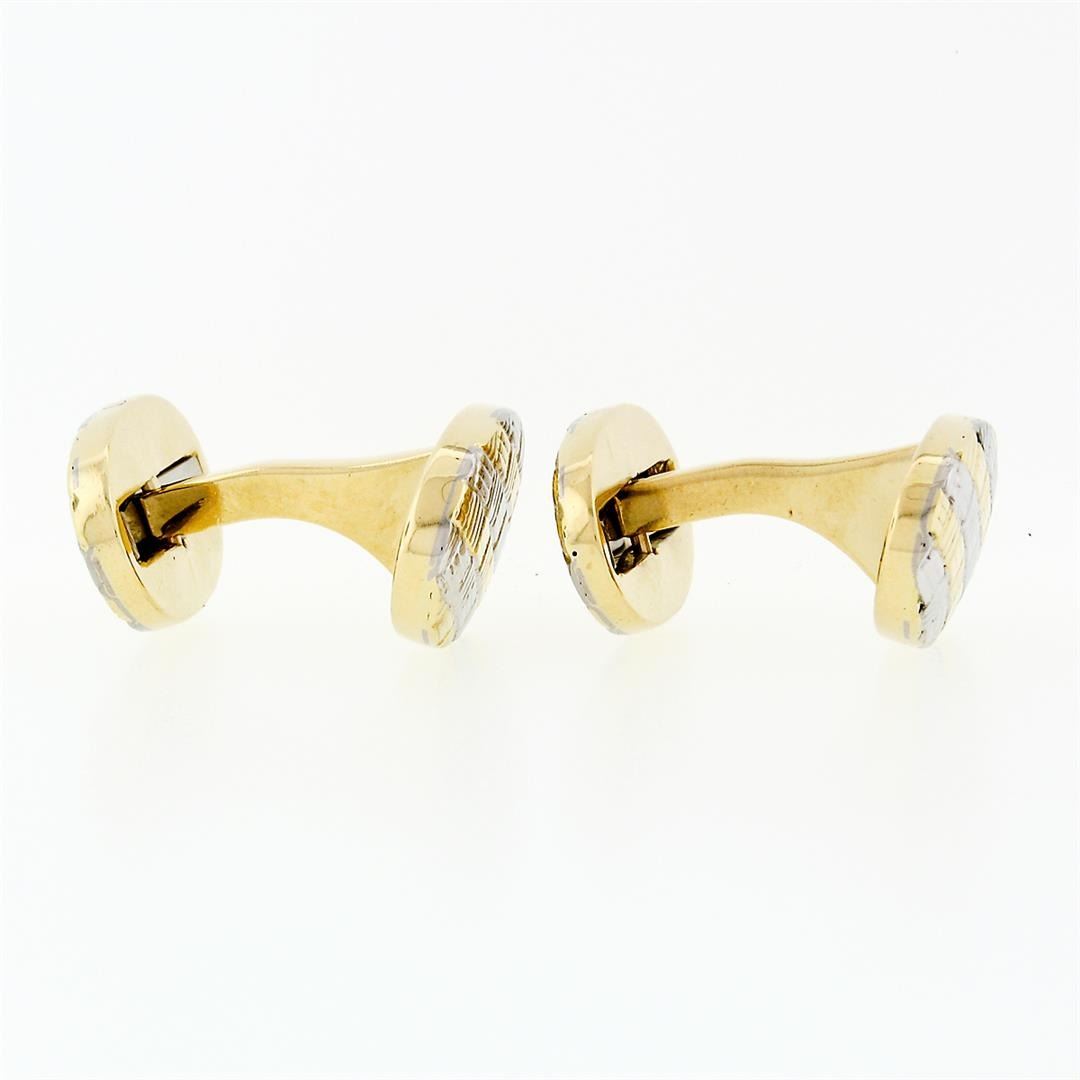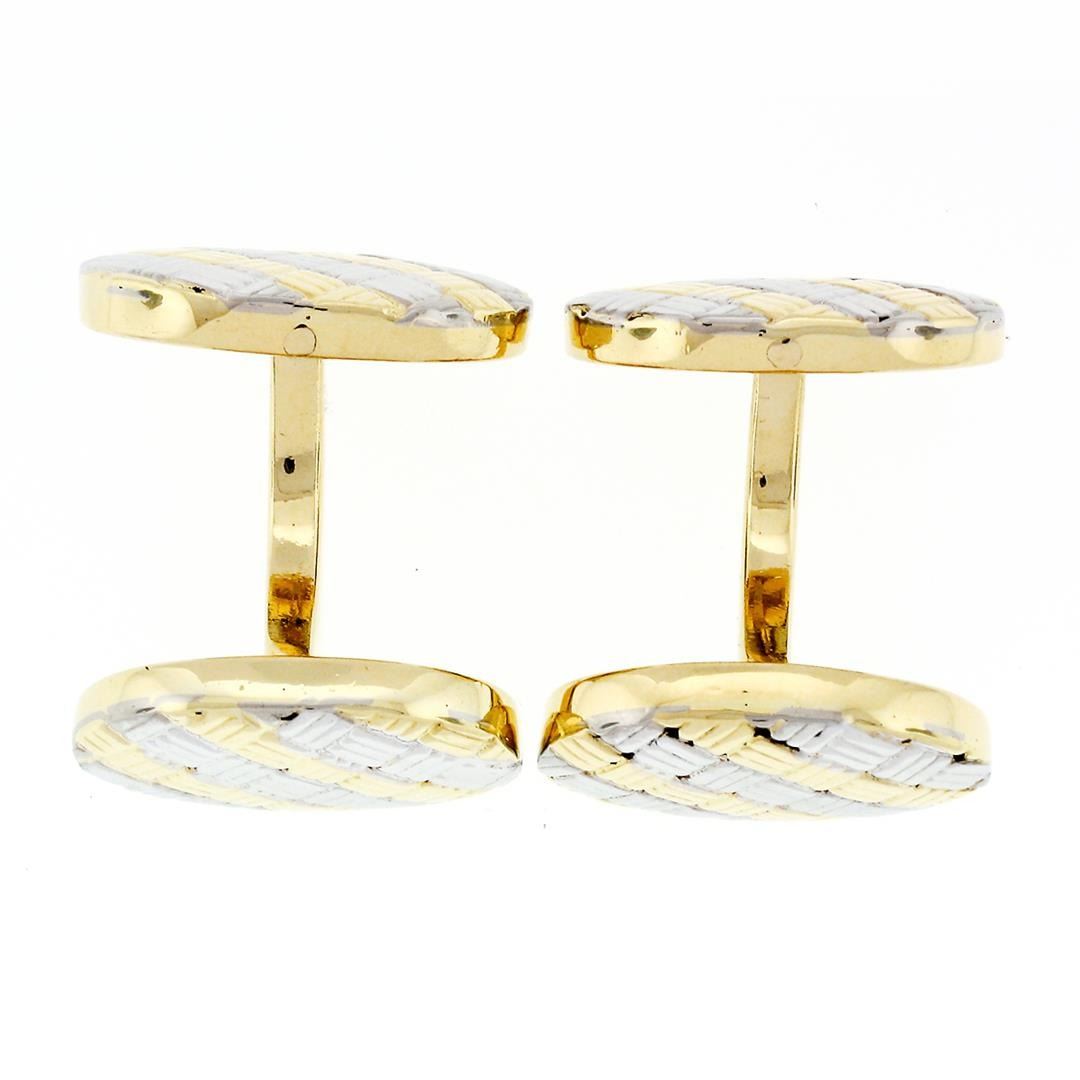 A pair of vintage solid 18k two tone gold cufflinks, with woven basket and weave pattern. These cuff links have a Swivel Back design with a clearance of 15mm, weigh a total of 28.52 grams, and the front panels measure 18x12.2mm.