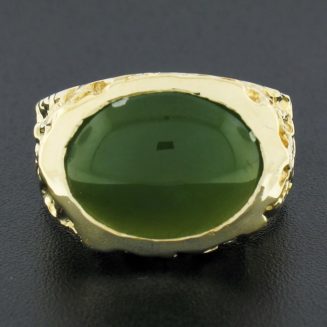 A vintage solid 14k yellow gold mens cocktail ring, with 1 oval cabochon cut natrual jade (15.2x11.5mm). The ring is size 10.0, weighs a total of 12.44 grams, and measures 14.8mm wide.