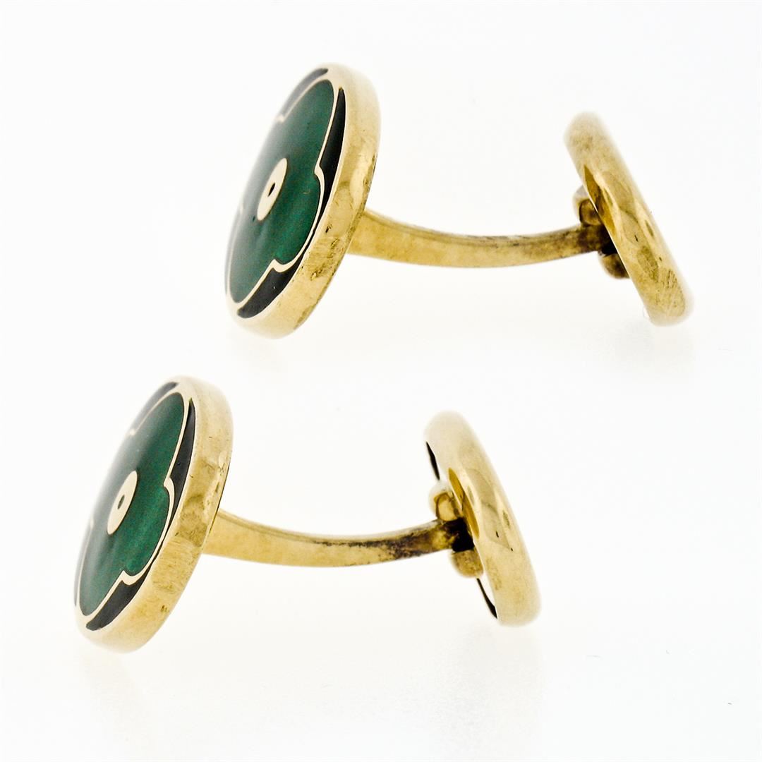 A vintage solid 18k yellow gold green black guilloche enamel cufflinks, with These cuff links have a swivel design with a clearance of 13mm, weigh a total of 16.77 grams, and the front panels measure 13.1x18.65mm.