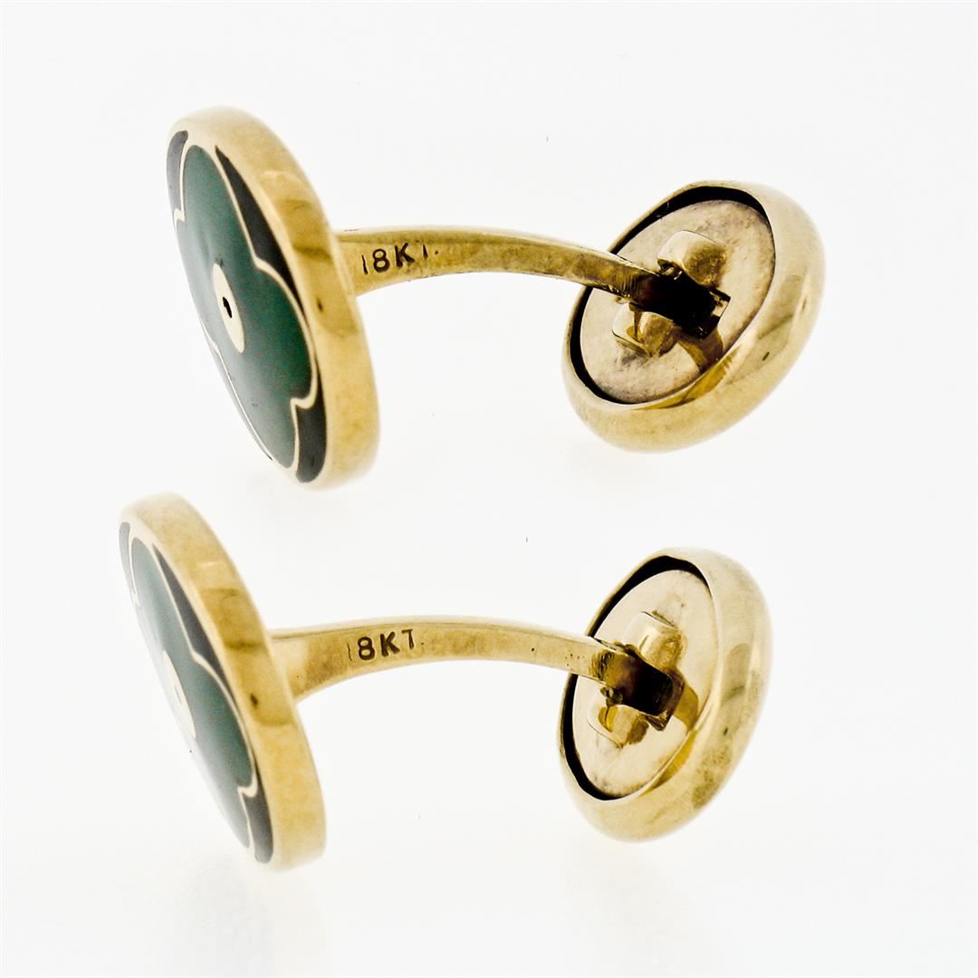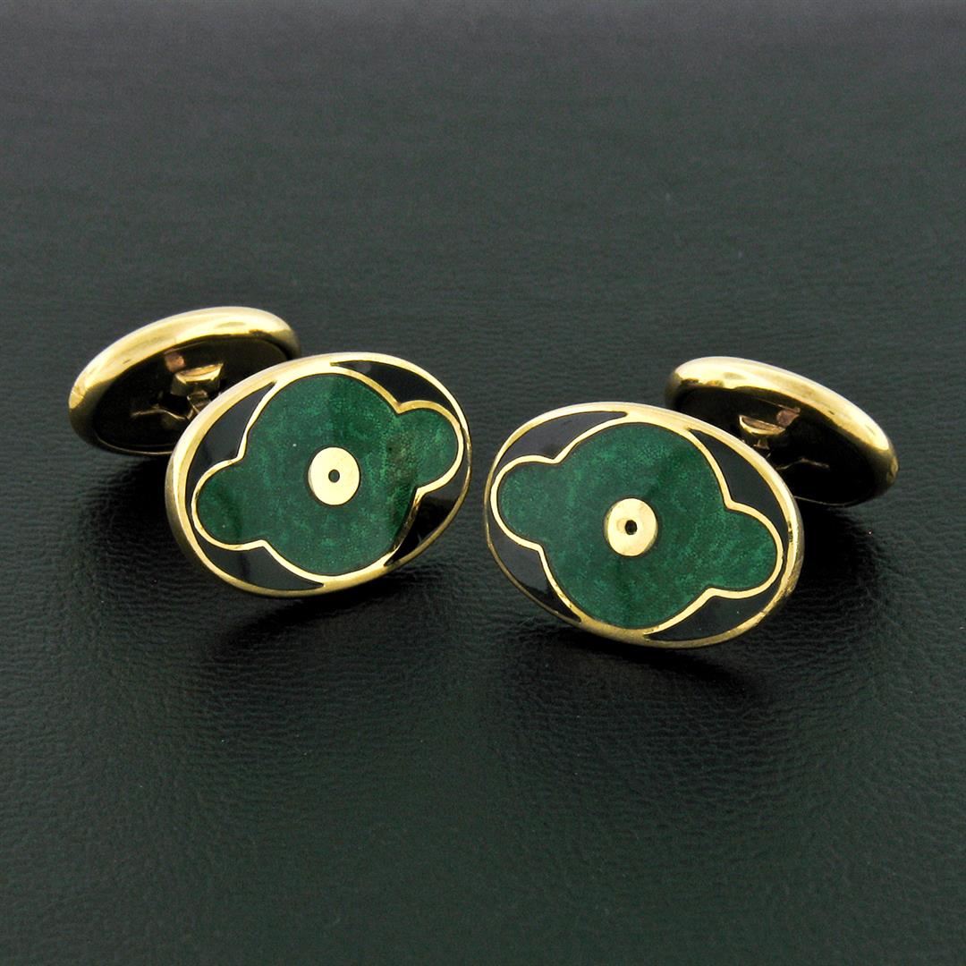 A vintage solid 18k yellow gold green black guilloche enamel cufflinks, with These cuff links have a swivel design with a clearance of 13mm, weigh a total of 16.77 grams, and the front panels measure 13.1x18.65mm.