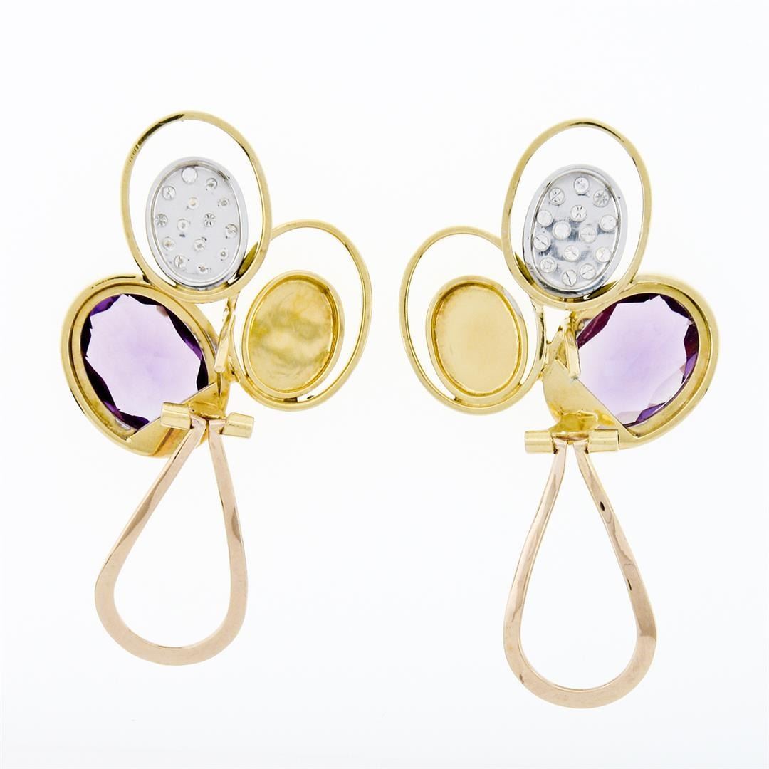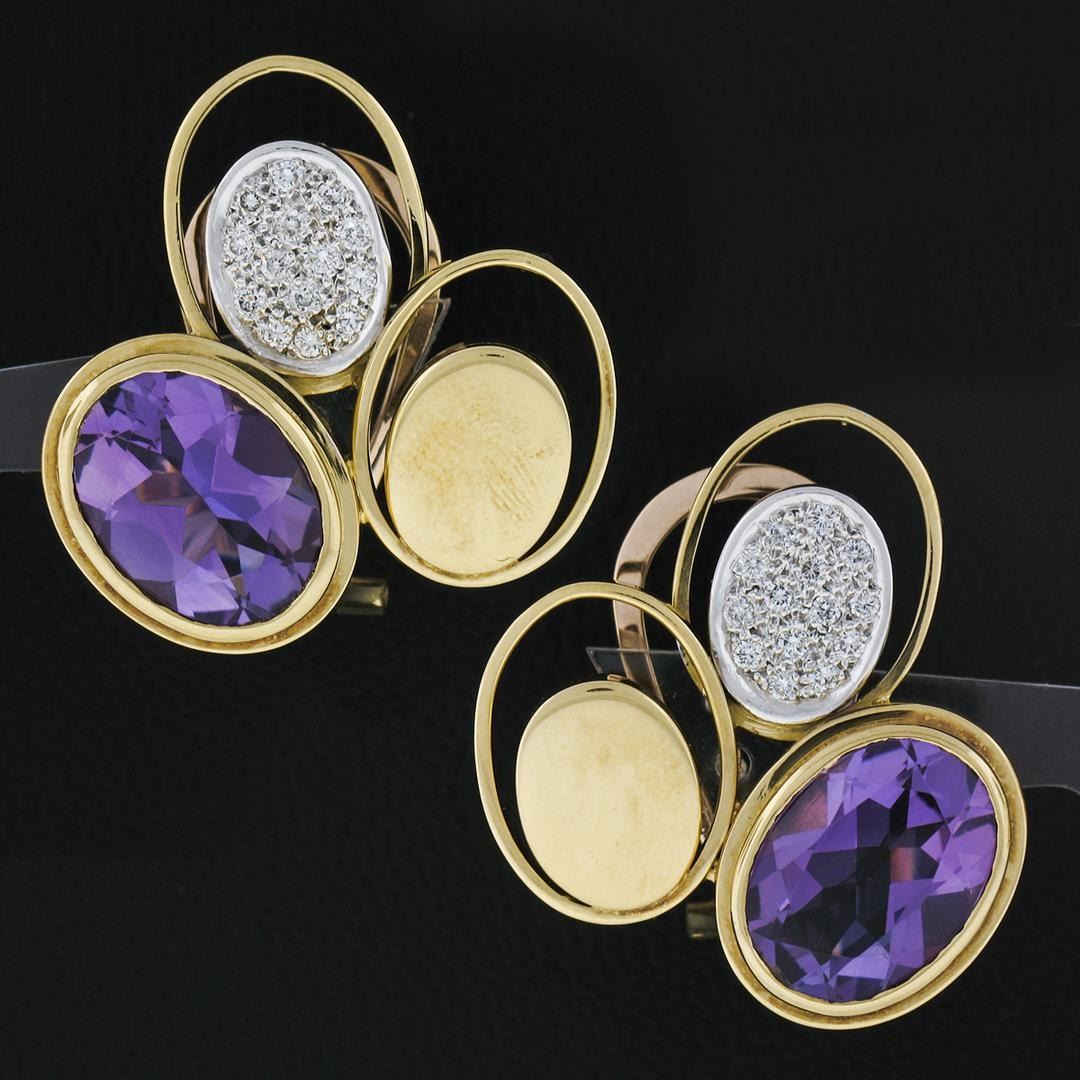 Vintage Modernist 18k Gold Amethyst Diamond Triple Oval Large Statement Earrings