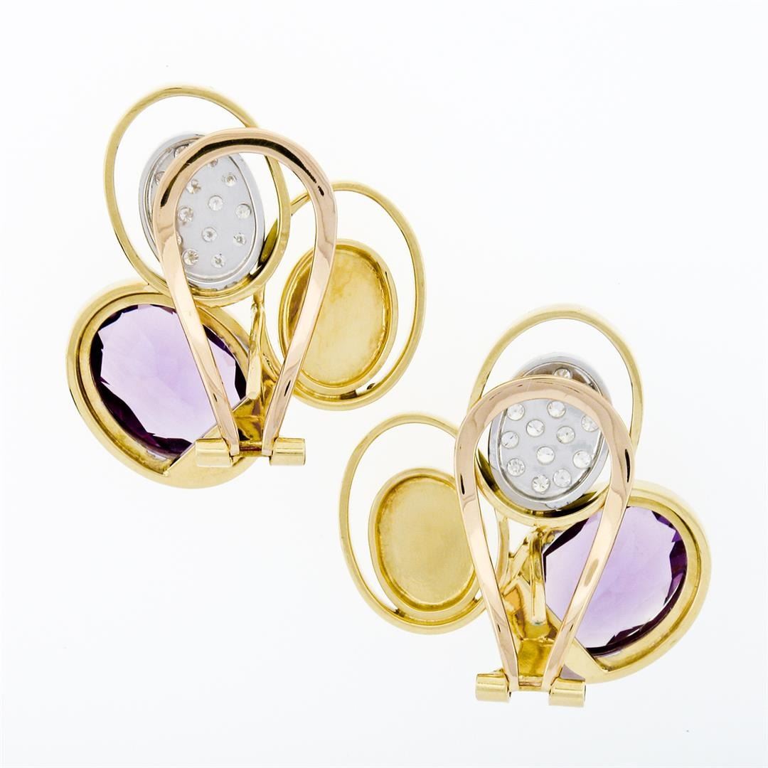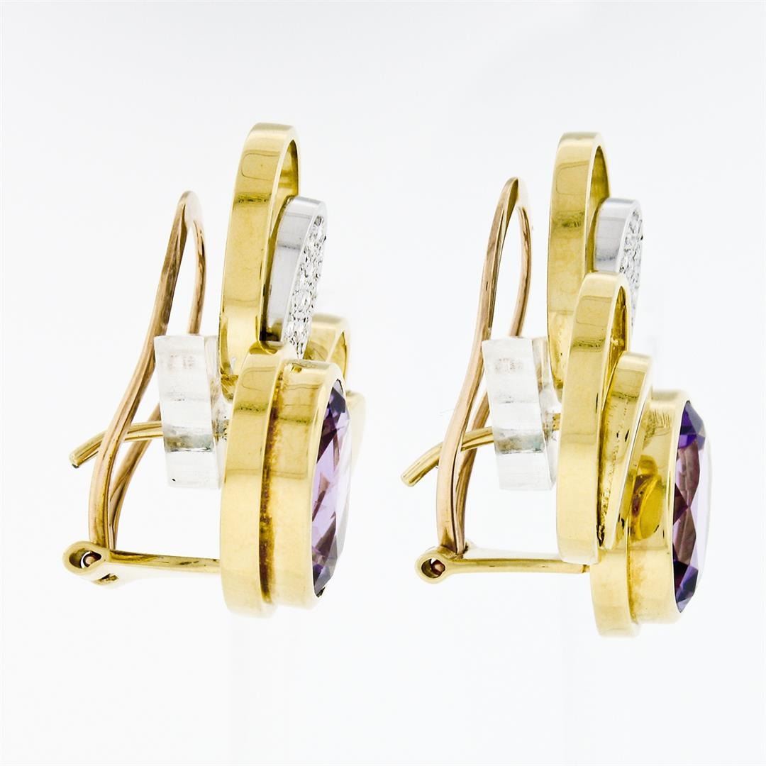 A vintage solid 18k yellow and white gold statement earrings, with 2 oval brilliant cut natural amethysts (14x11mm - 13ctw ), and 28 round brilliant cut natural diamonds (G/H - VS1/VS2 ; 0.40ctw). The earrings measure approximately 30.6x26.55mm and weigh a total of 23.86 grams.