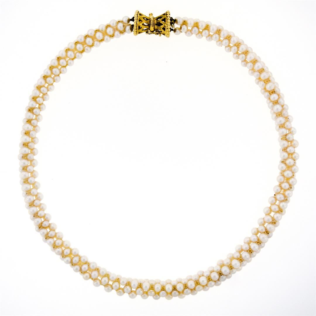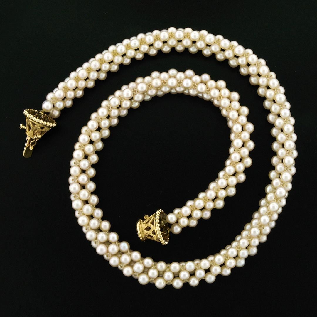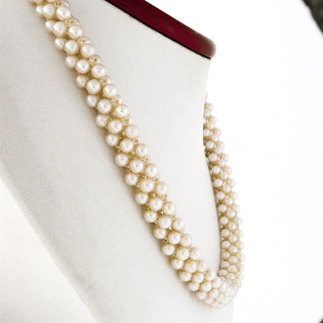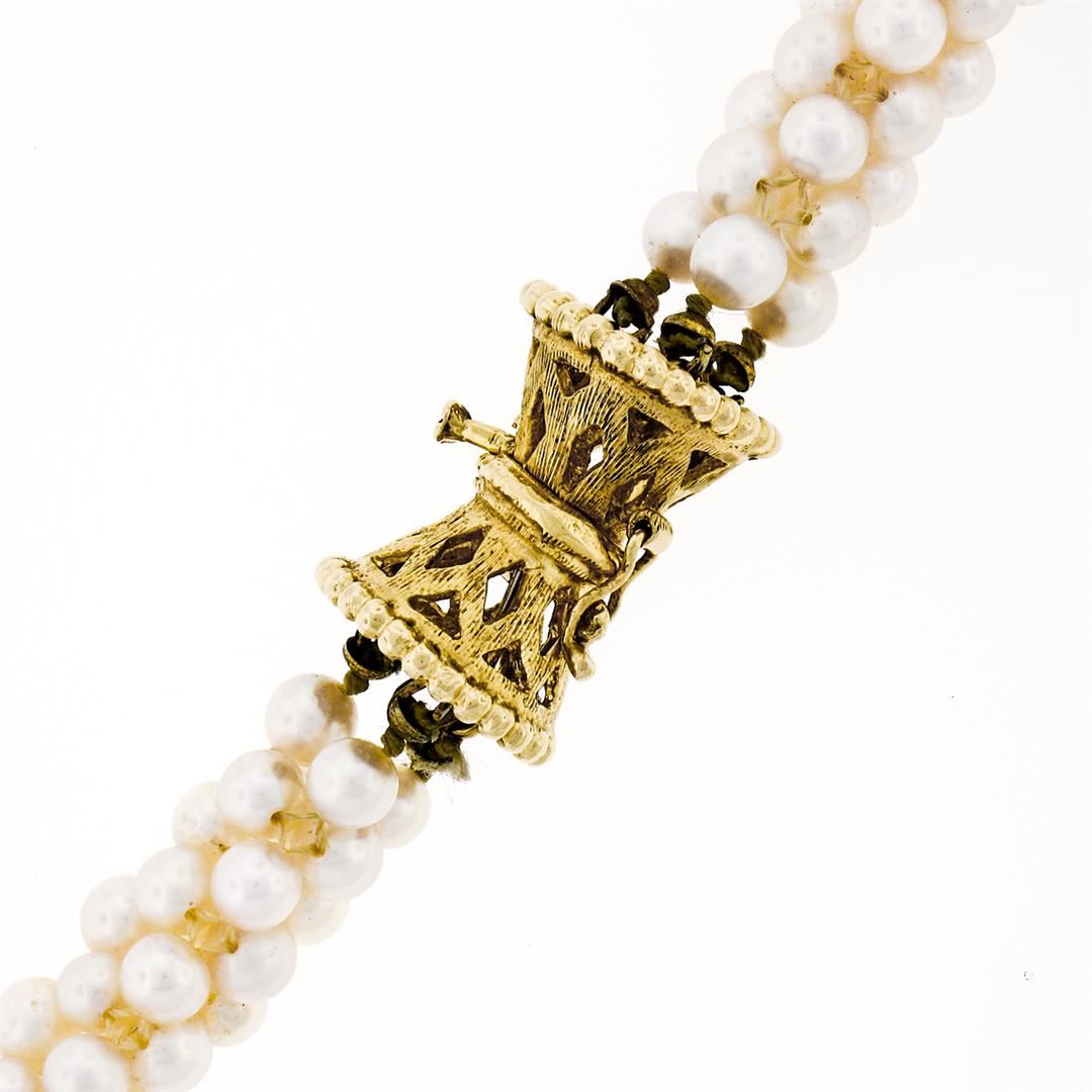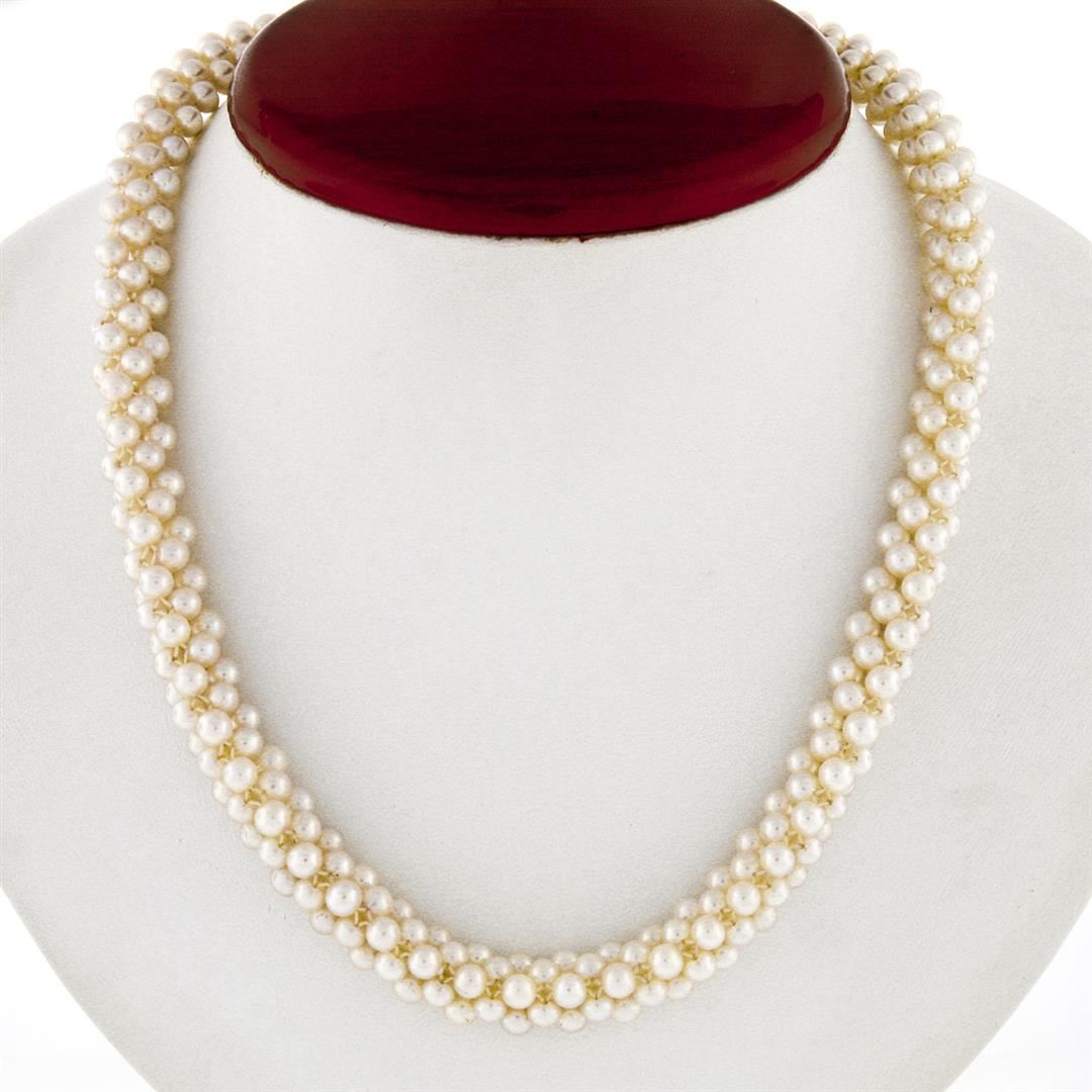 A vintage multi strand pearl necklace and solid 14k yellow gold clasp, featuring 399 round shape natrual cultured pearls (4.0 - 4.5mm). 16 inch multi strand pearl link chain, 49.27 grams total weight.
