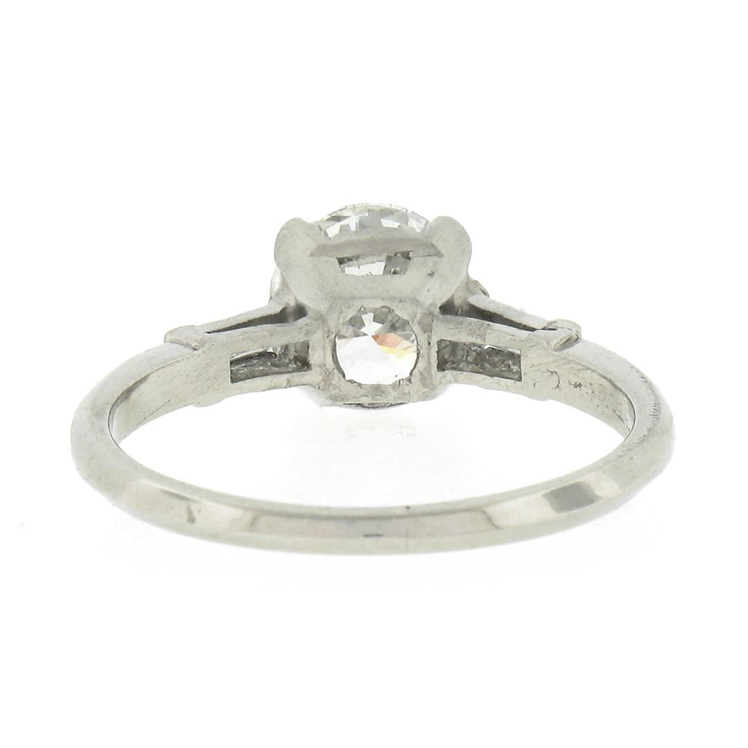 A vintage solid platinum engagement ring, with 1 GIA graded round brilliant cut natural diamond (F - VS1 ; 0.94ct), and 2 straight baguette cut natural diamonds (F/G - VS1/VS2 ; 0.20ctw). The ring is size 4.5, weighs a total of 2.79 grams, and measures 6.3mm wide. Comes with all original relevant certifications.