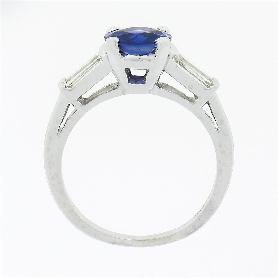 A solid platinum engagement ring, with 1 round cut natural blue sapphire (1.04ct), and 2 tapered baguette cut natural diamonds (H/I - VS1/VS2 ; 0.44ctw). The ring is size 4.0, weighs a total of 4.57 grams, and measures 6.70mm wide