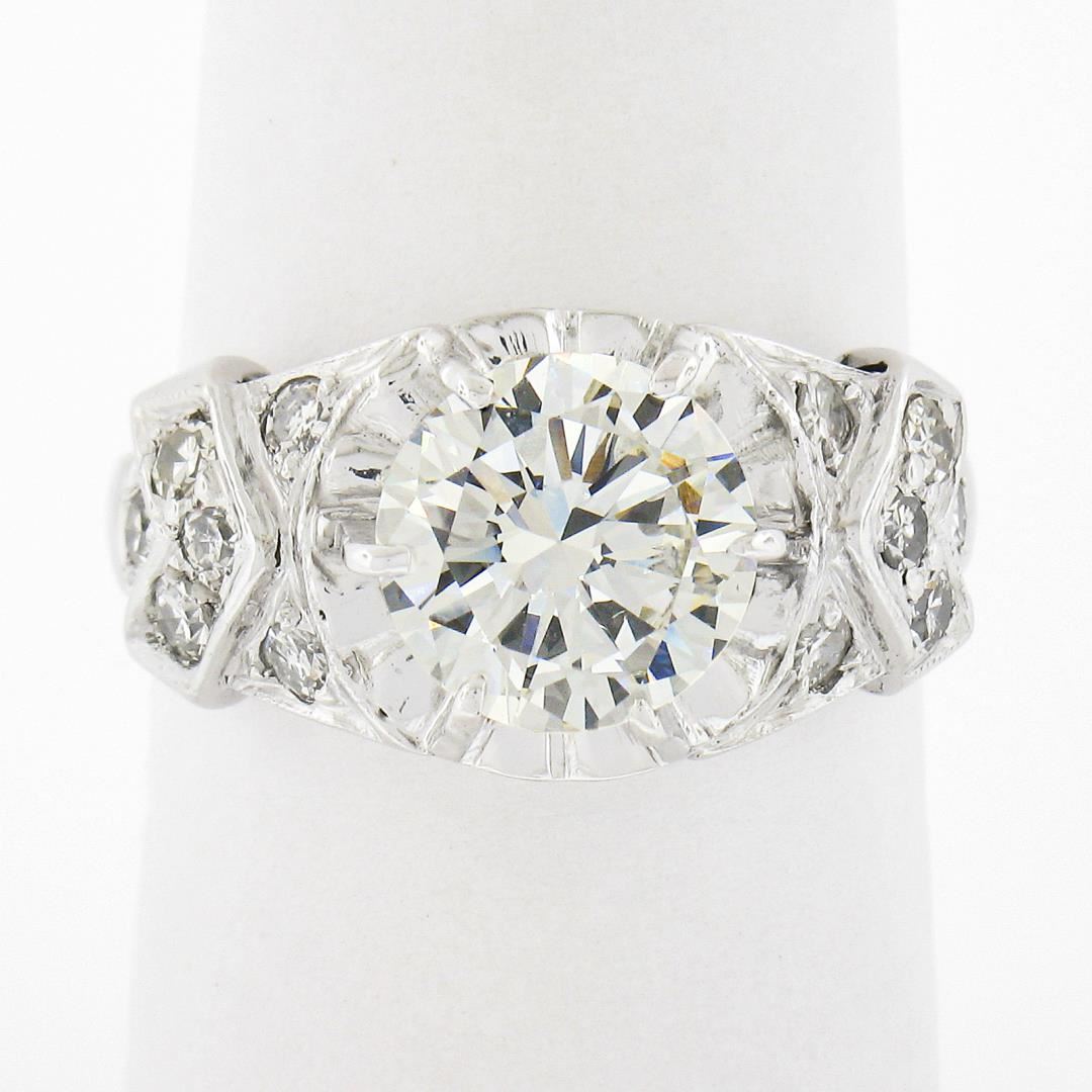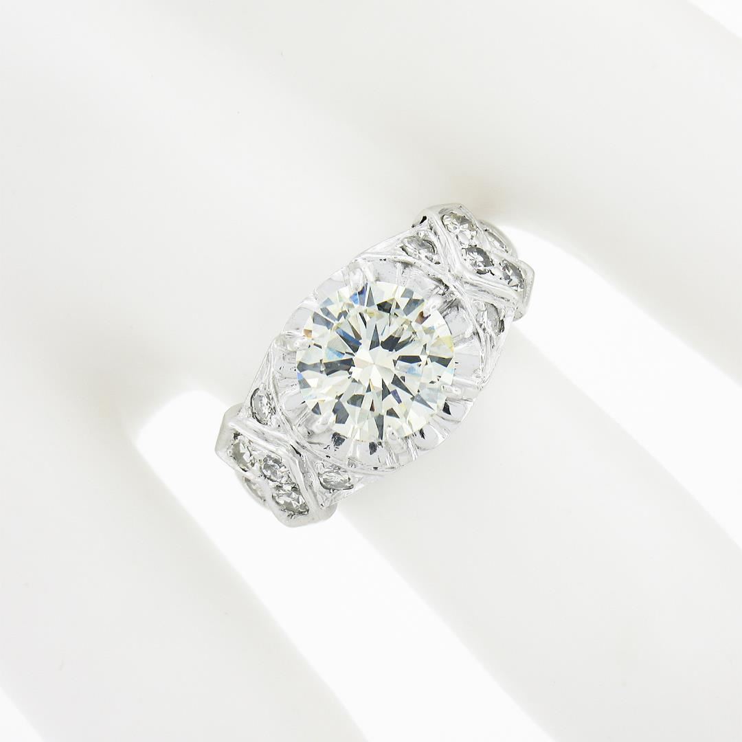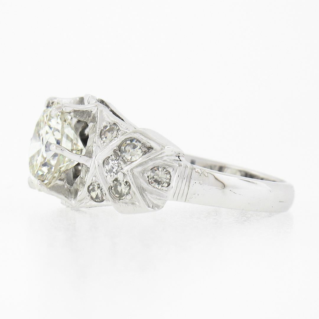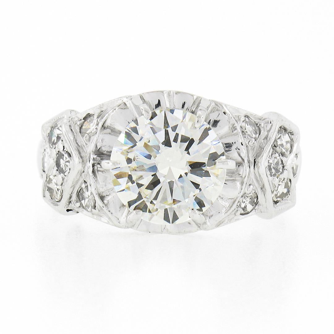 A vintage platinum engagement ring, with 1 GIA graded round brilliant cut natural diamond (L - VS2 ; 1.85ct), and 12 old single cut natural diamonds ( I/J - VS2/SI2 ; 0.30ctw ). The ring is size 6.5, weighs a total of 6.41 grams, and measures 10.2mm wide. Comes with all original relevant certifications.