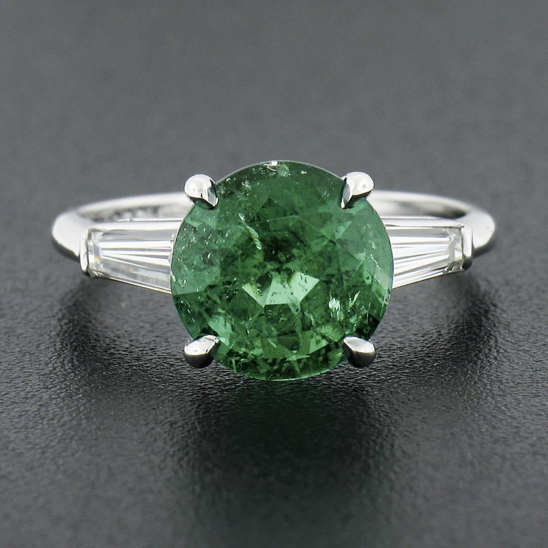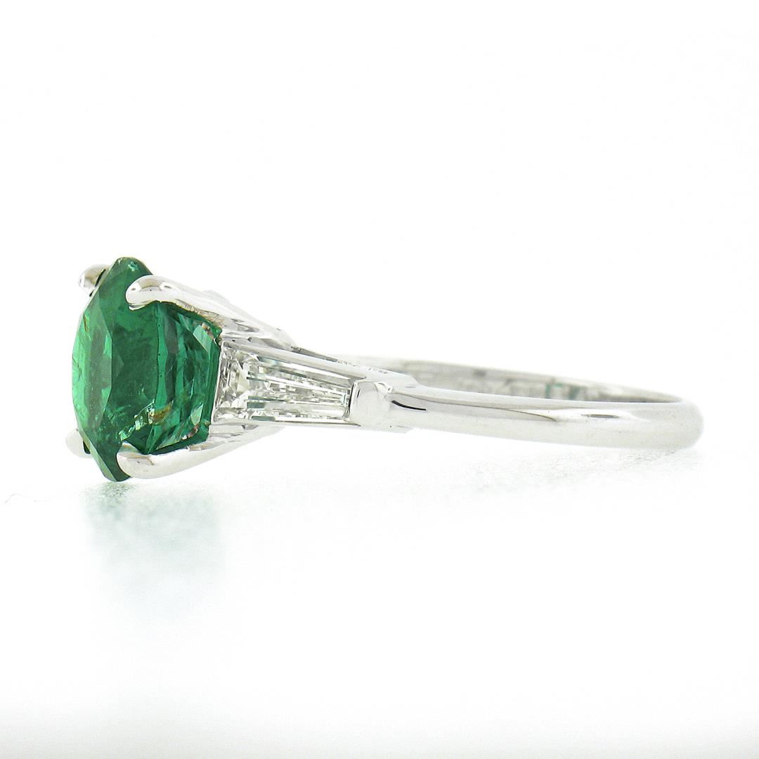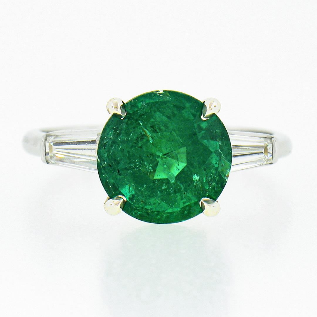 A vintage solid platinum ring, with 1 GIA graded round brilliant cut natural emerald (2.48ct), and 2 baguette cut natural diamonds (G/H - VS1/VS2 ; 0.56ctw). The ring is size 6.0, weighs a total of 4.12 grams, and measures 9mm wide. Comes with all original relevant certifications.