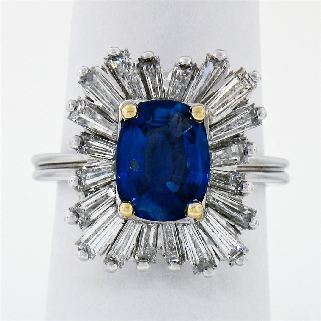A vintage solid platinum and 18k yellow gold ballerina ring, with 1 AGL cretified cushion cut natural sapphire (2.08ct), and 20 baguette cut natural diamonds (F/G - VS1/VS2 ; 1.35ctw). The ring is size 6.0, weighs a total of 9.36 grams, and measures 15.0mm wide. Comes with all original relevant certifications.