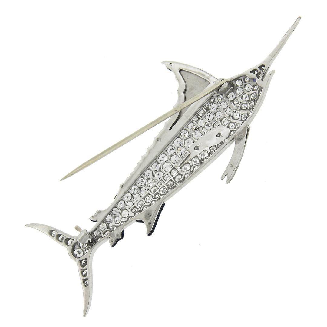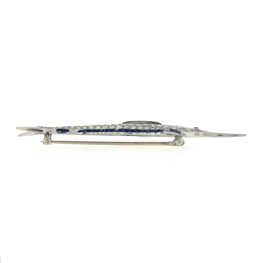 A vintage solid platinum & enamel work large brooch, with 119 round brilliant & single cut natural diamonds (E/F - VVS2/VS2 ; 3.50-4.0ctw), and 1 round brilliant cut natural sapphire (0.02ctw ). Measures 77.60x29.3mm and weighs a total of 13.01 grams.