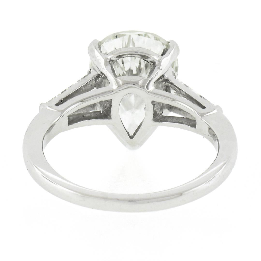 A vintage solid platinum engagement ring, with1 GIA graded pear cut natural diamond (H - VS2 ; 3.02ct), and 2 baguette cut natural diamonds (G/H - VS1/VS2 ; 0.60ctw). The ring is size 4.5, weighs a total of 4.82 grams, and measures 12.3mm wide. Comes with all original relevant certifications.