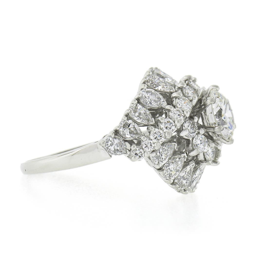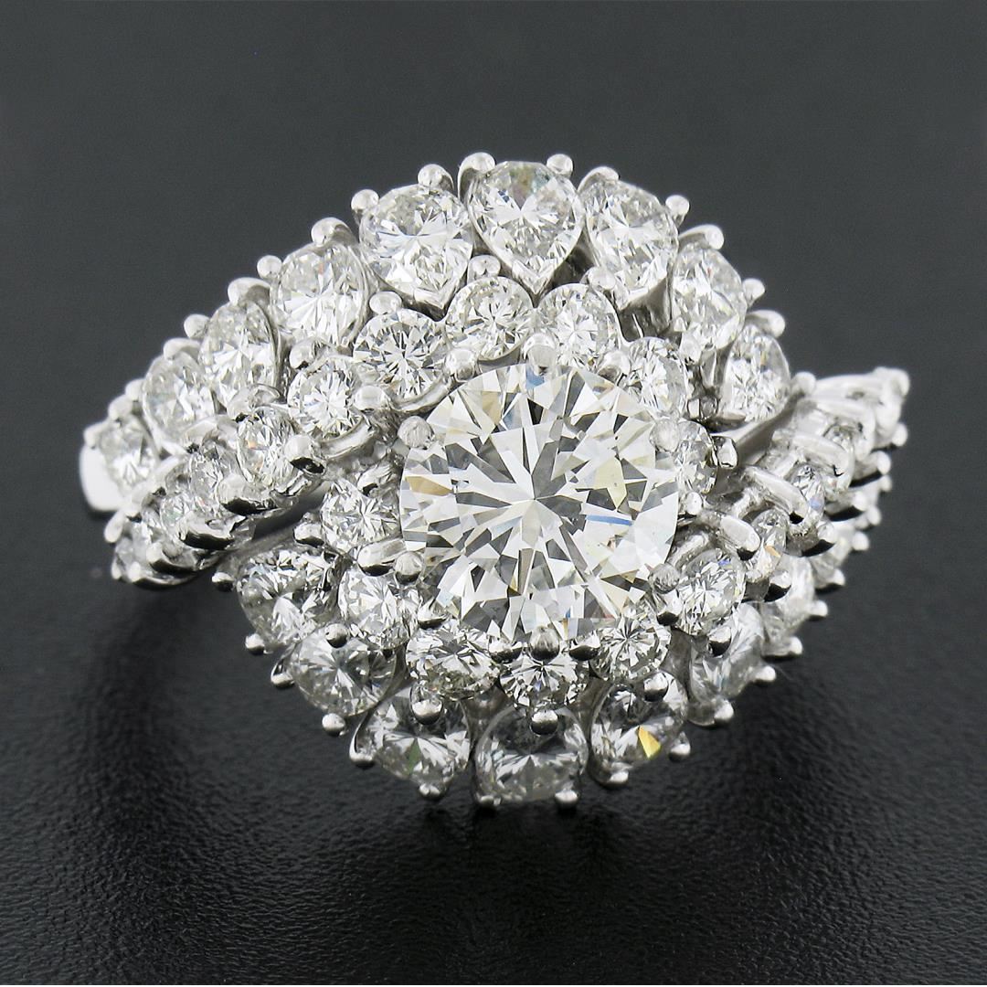 A vintage solid platinum swirl ring, with 1 GIA graded round brilliant cut natural diamond (J - SI2 ; 1.53ct), surrounded with a halo of 18 pear cut and 22 round brilliant cut natural diamonds (I/J Color - VS2/SI1 ; 3.05ctw). The ring is size 8.0, weighs a total of 11.46 grams, and measures 18.30mm wide. Comes with all original relevant certifications.