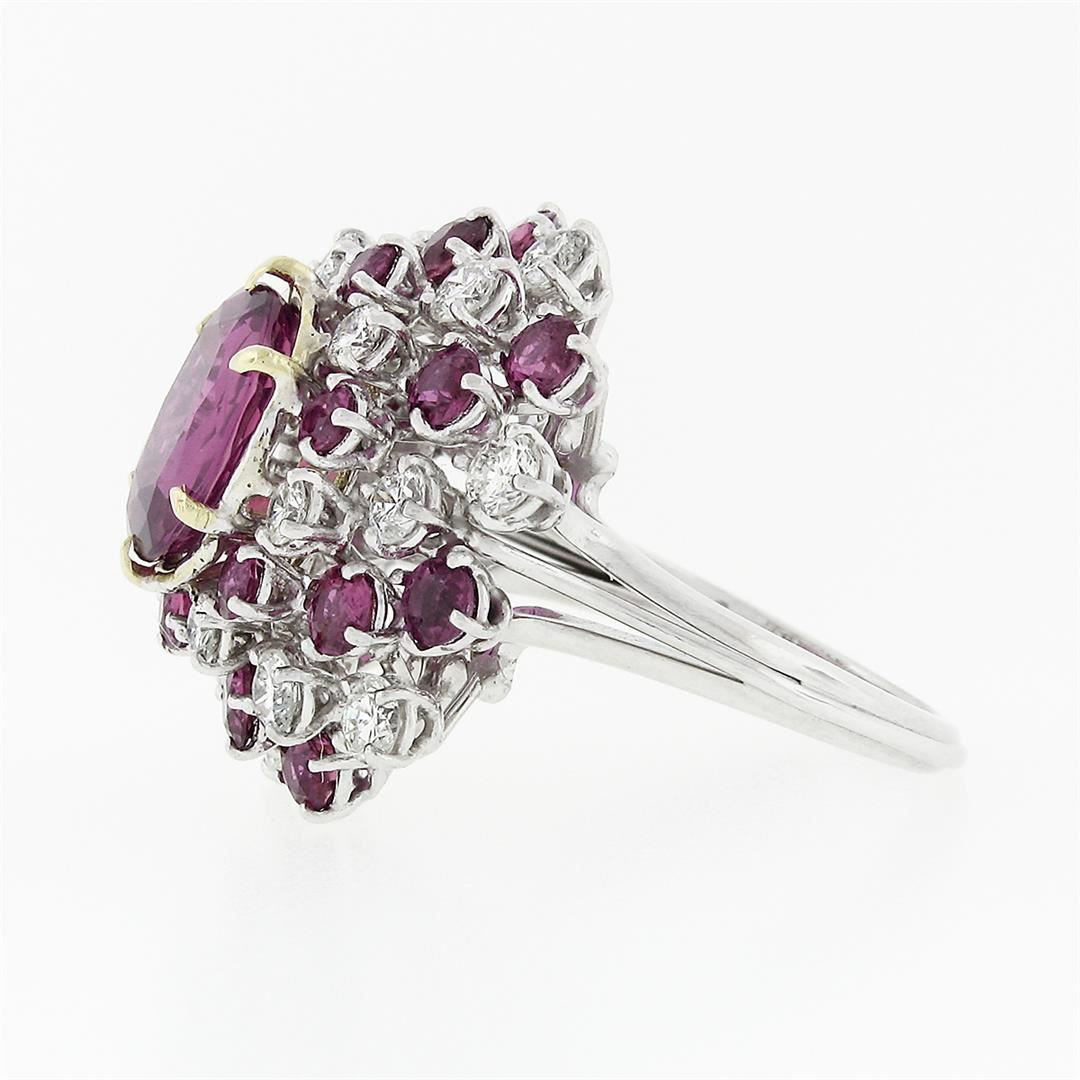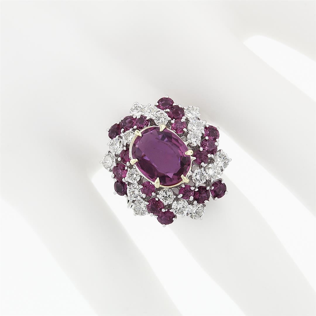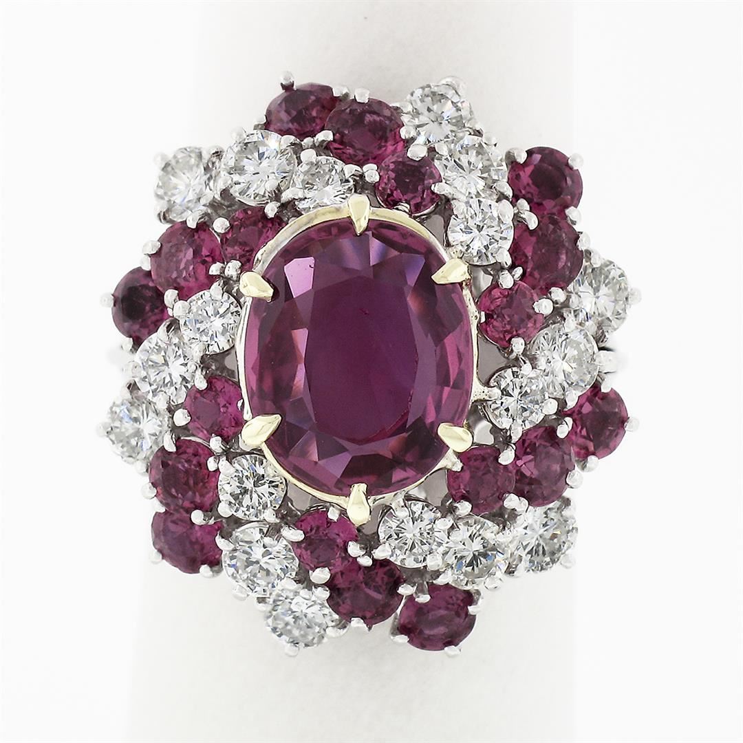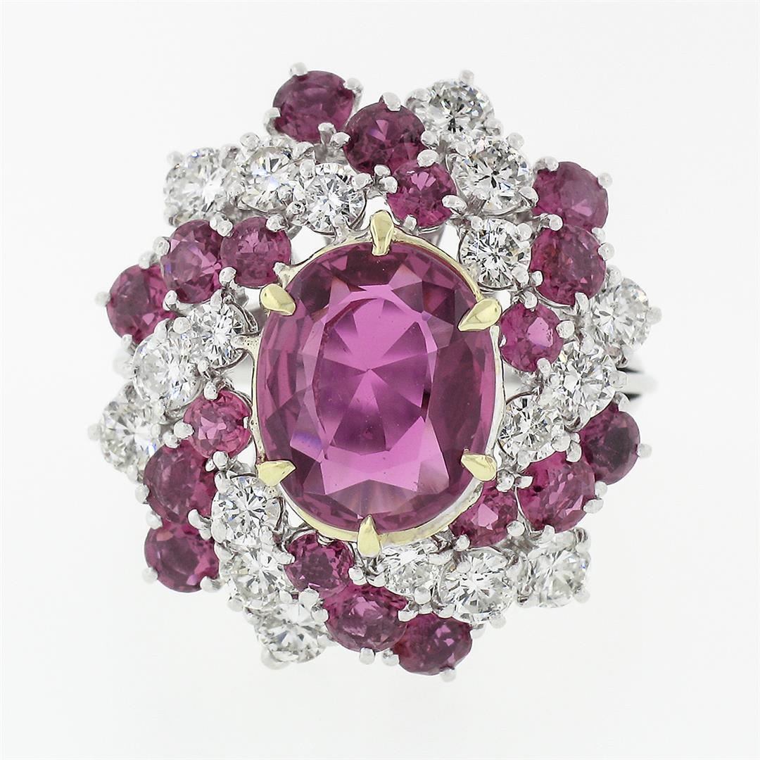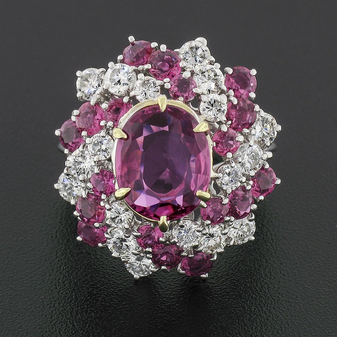 A solid platinum and 18k yellow gold swirl ring, with 1 Gia certified oval cut natural sapphire (3.30ct), and 18 round brilliant cut naturak diamonds (G/H - VS1/VS2 ; 1.44ctw), with 18 round brilliant cut natural sapphires (2.16ctw). The ring is size 6.5