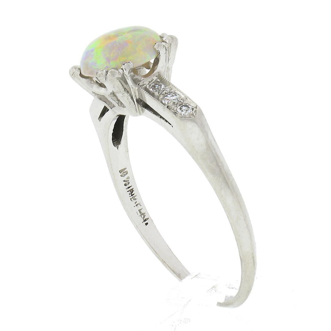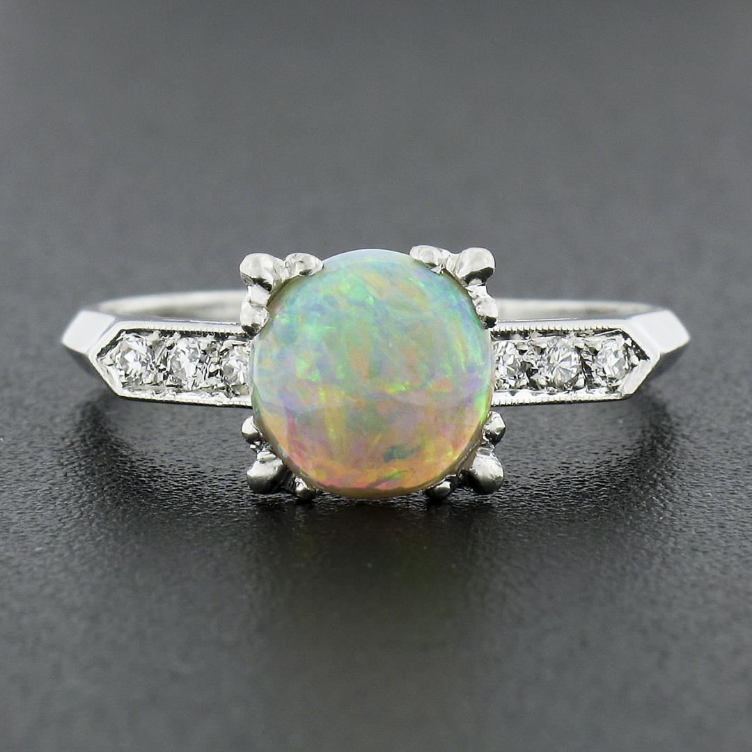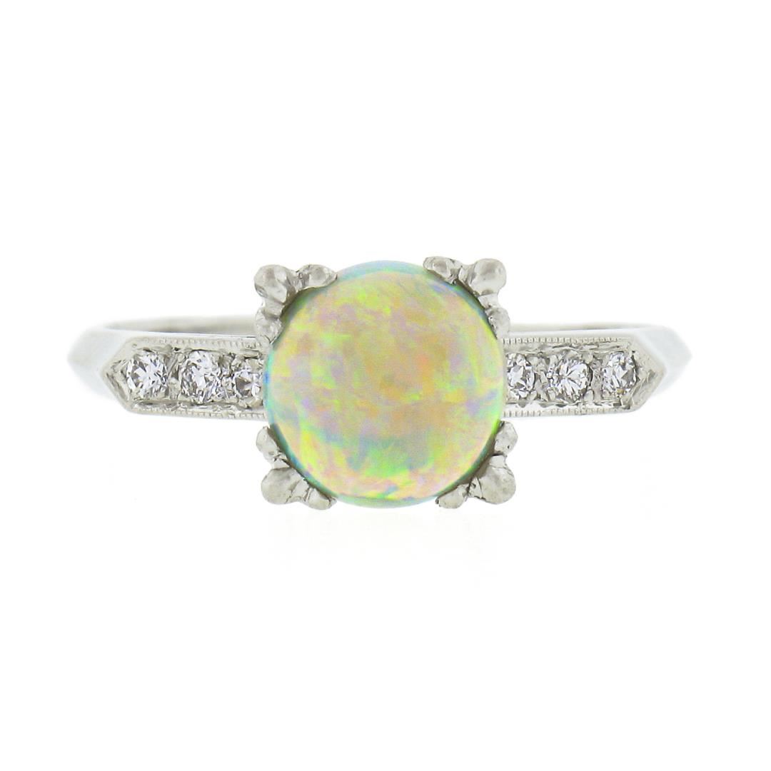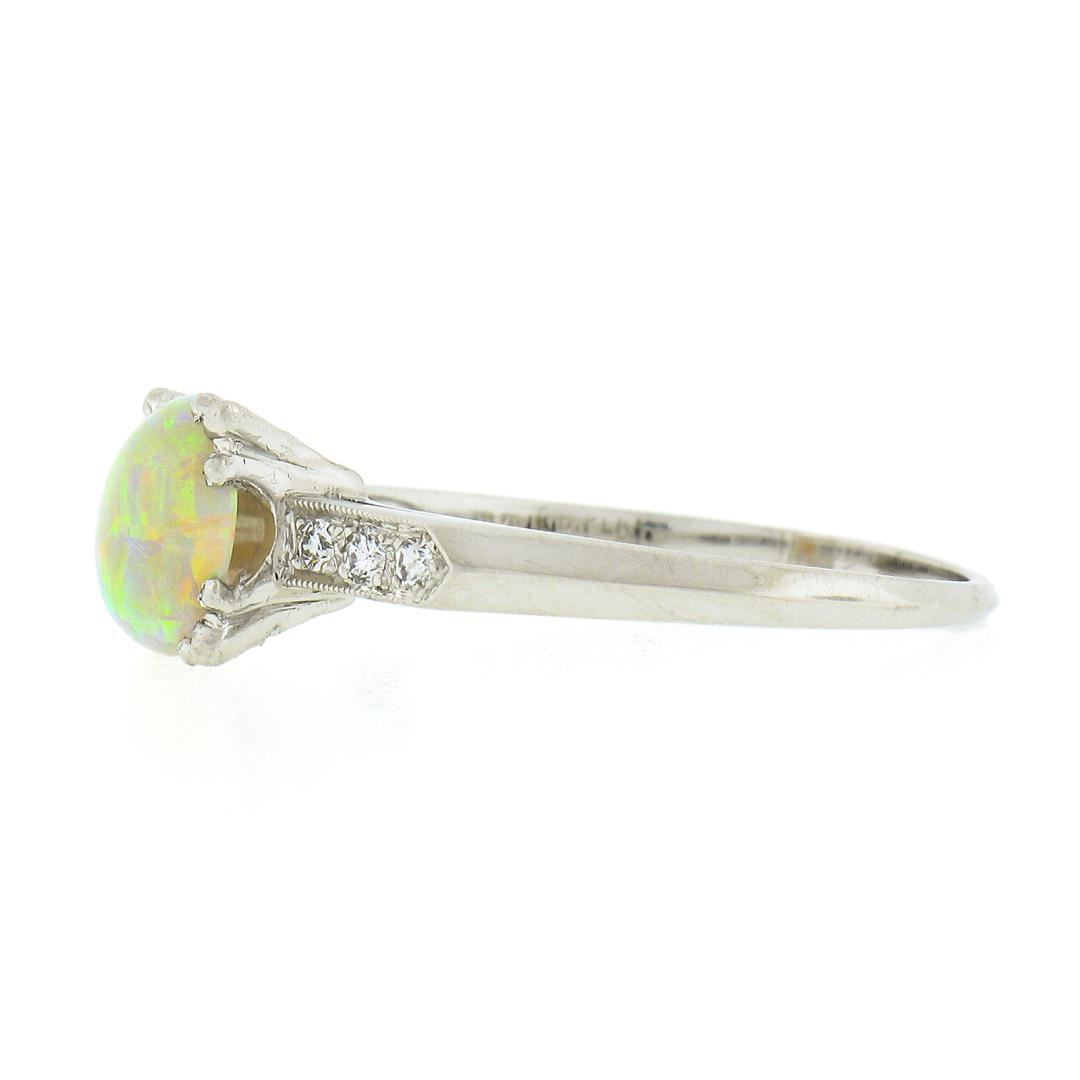 A vintage solid platinum ring, with 1 round cabochon cut natural opal (7.6mm), accented with 6 old transitional & old single cut natural diamonds (G/H - VS2/SI1 ; 0.10ctw). The ring is size 8.0, weighs a total of 3.98 grams, and measures 7.8mm wide.