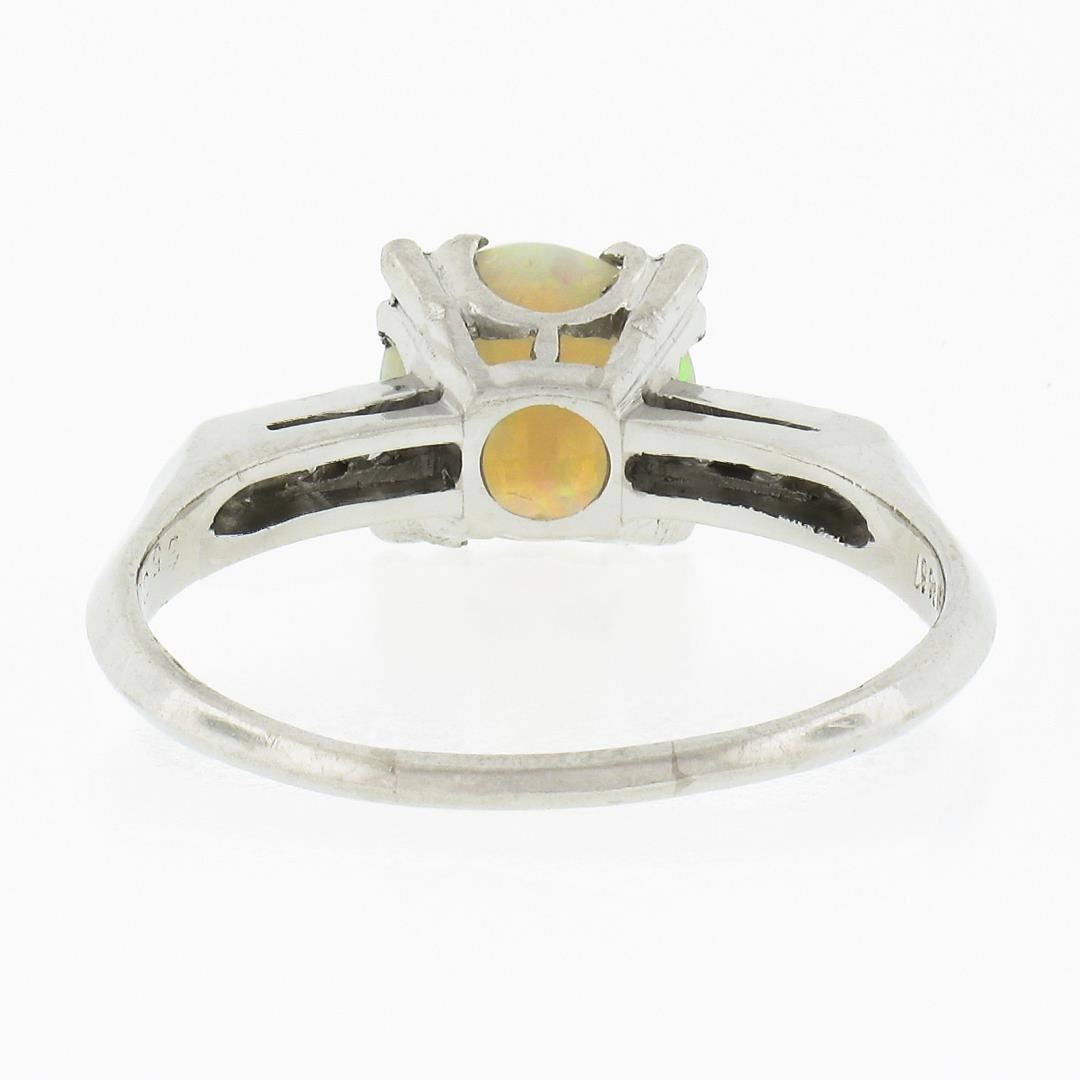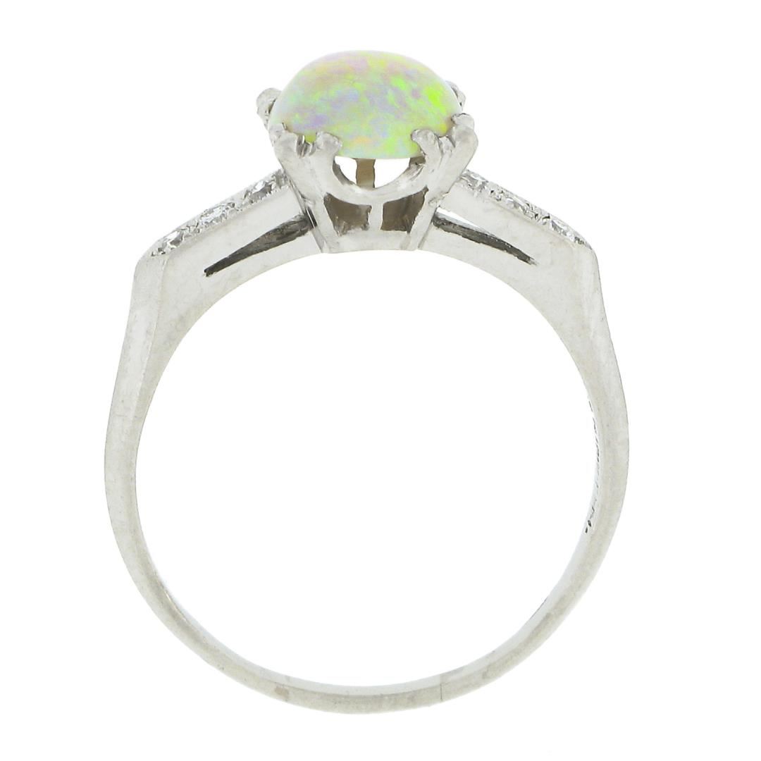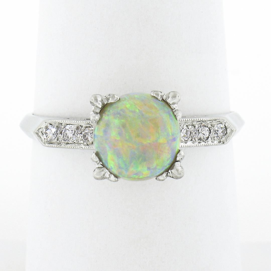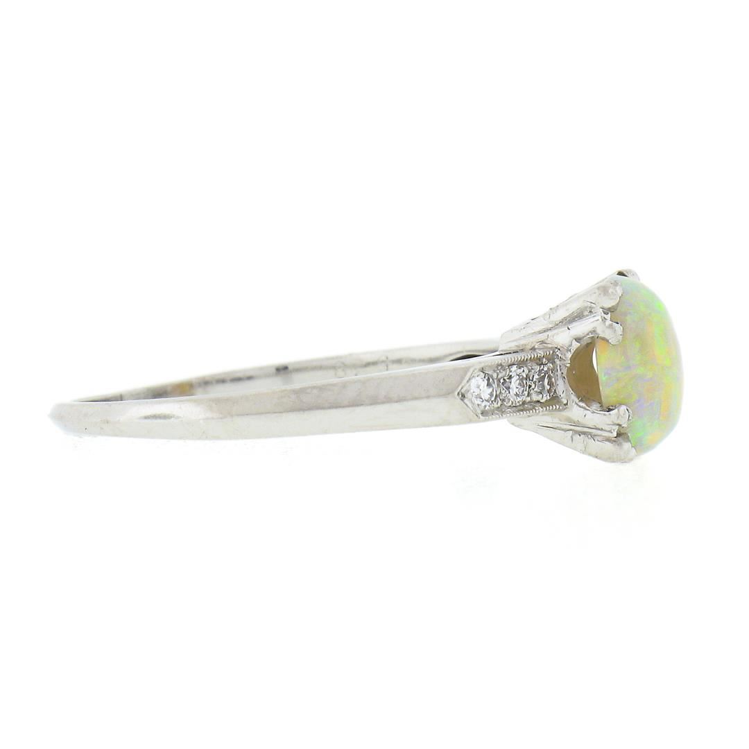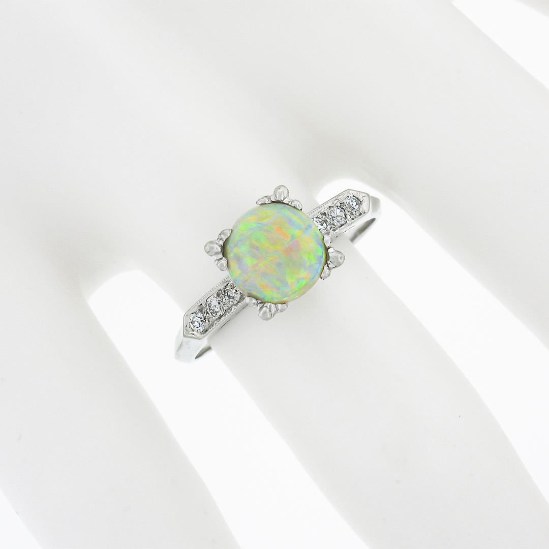 A vintage solid platinum ring, with 1 round cabochon cut natural opal (7.6mm), accented with 6 old transitional & old single cut natural diamonds (G/H - VS2/SI1 ; 0.10ctw). The ring is size 8.0, weighs a total of 3.98 grams, and measures 7.8mm wide.