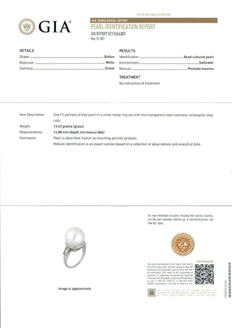 A solid platinum ring, with 1 Gia certified button shape cultured pearl (14.88mm), and 2 straight baguette cut natural diamonds (G/H - VS1/VS2 ; 0.60ctw). The ring is size 6.5, weighs a total of 13.42 grams, and measures 14.8mm wide. Comes with all origin