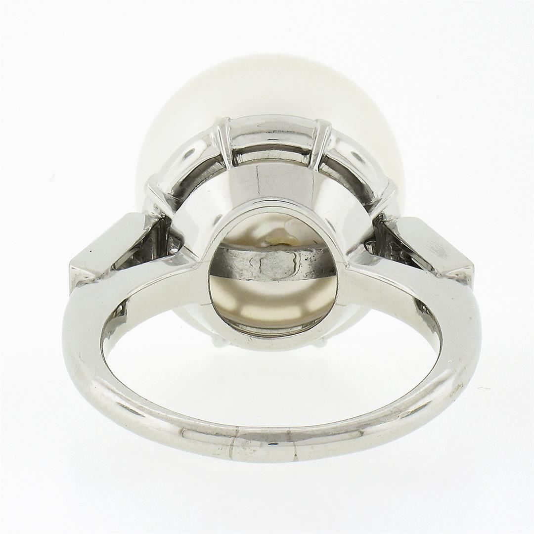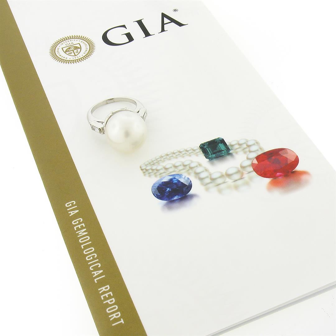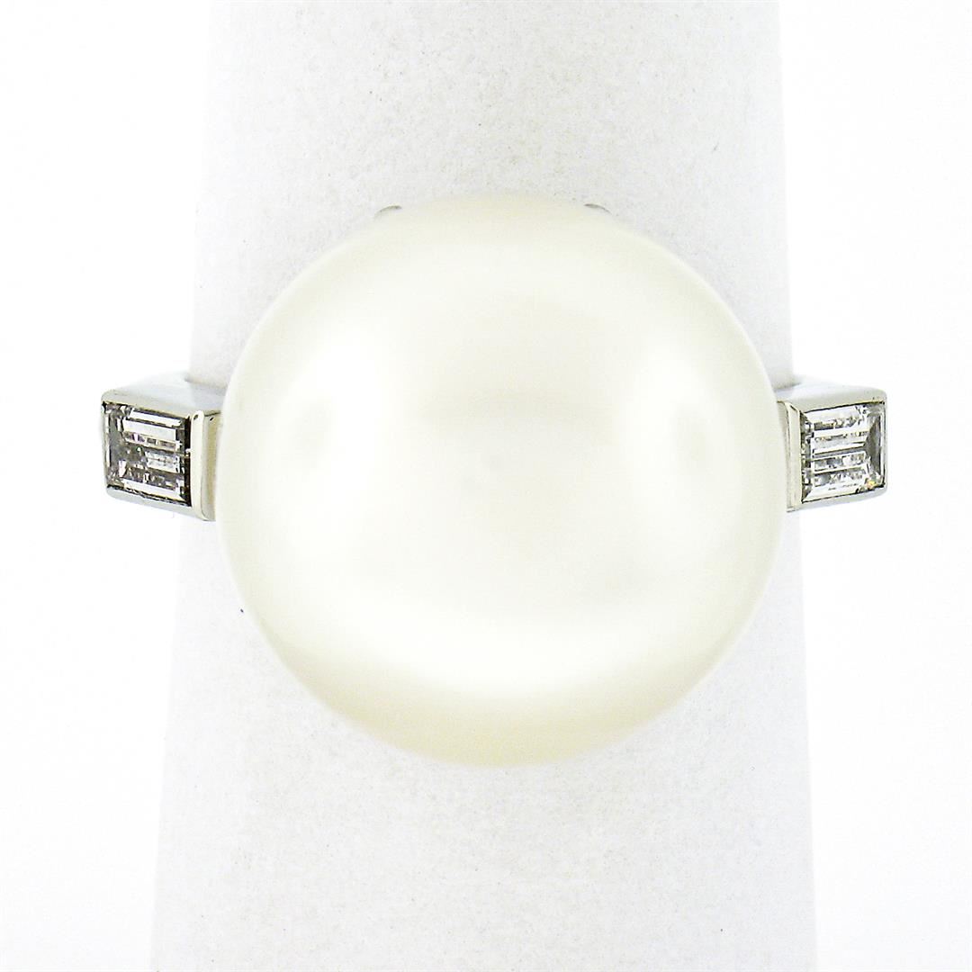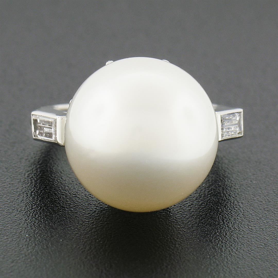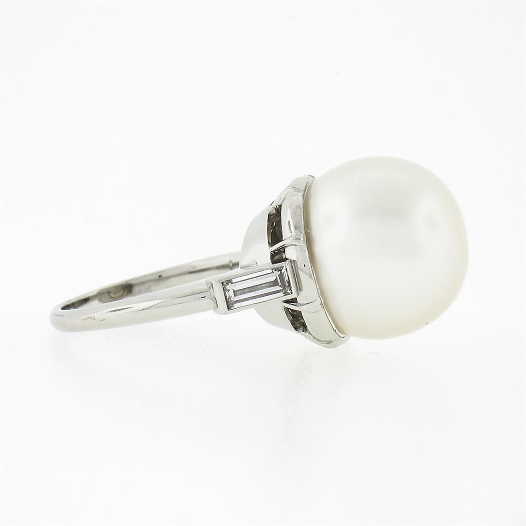 A solid platinum ring, with 1 Gia certified button shape cultured pearl (14.88mm), and 2 straight baguette cut natural diamonds (G/H - VS1/VS2 ; 0.60ctw). The ring is size 6.5, weighs a total of 13.42 grams, and measures 14.8mm wide. Comes with all original relevant certifications.