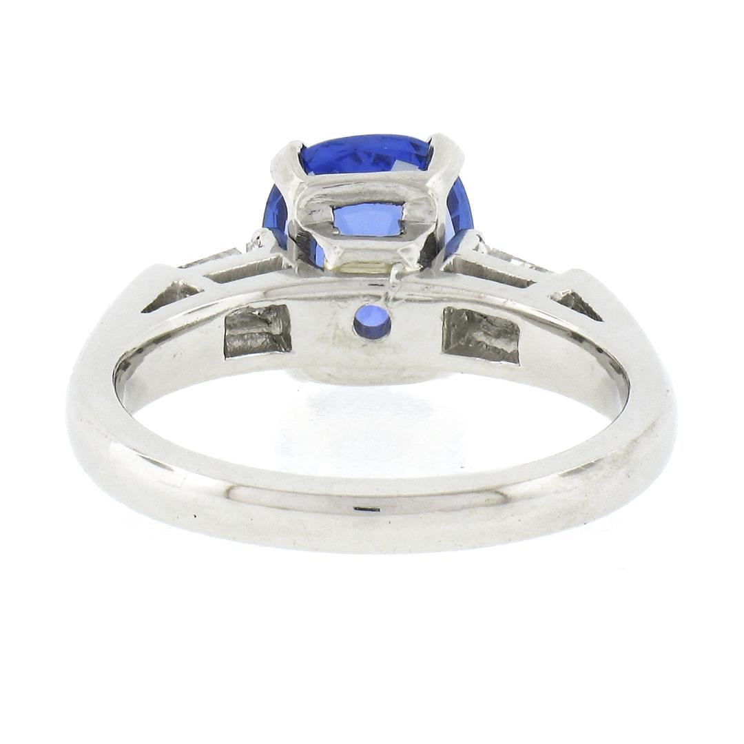 A vintage platinum engagement ring, with 1 GIA graded cushion cut natural sapphire (2.46ct), and 2 tapered baguette cut natural diamonds (F/G - VS1/VS2 ; 0.50ctw). The ring is size 4.5, weighs a total of 7.09 grams, and measures 8.92mm wide. Comes with all original relevant certifications.