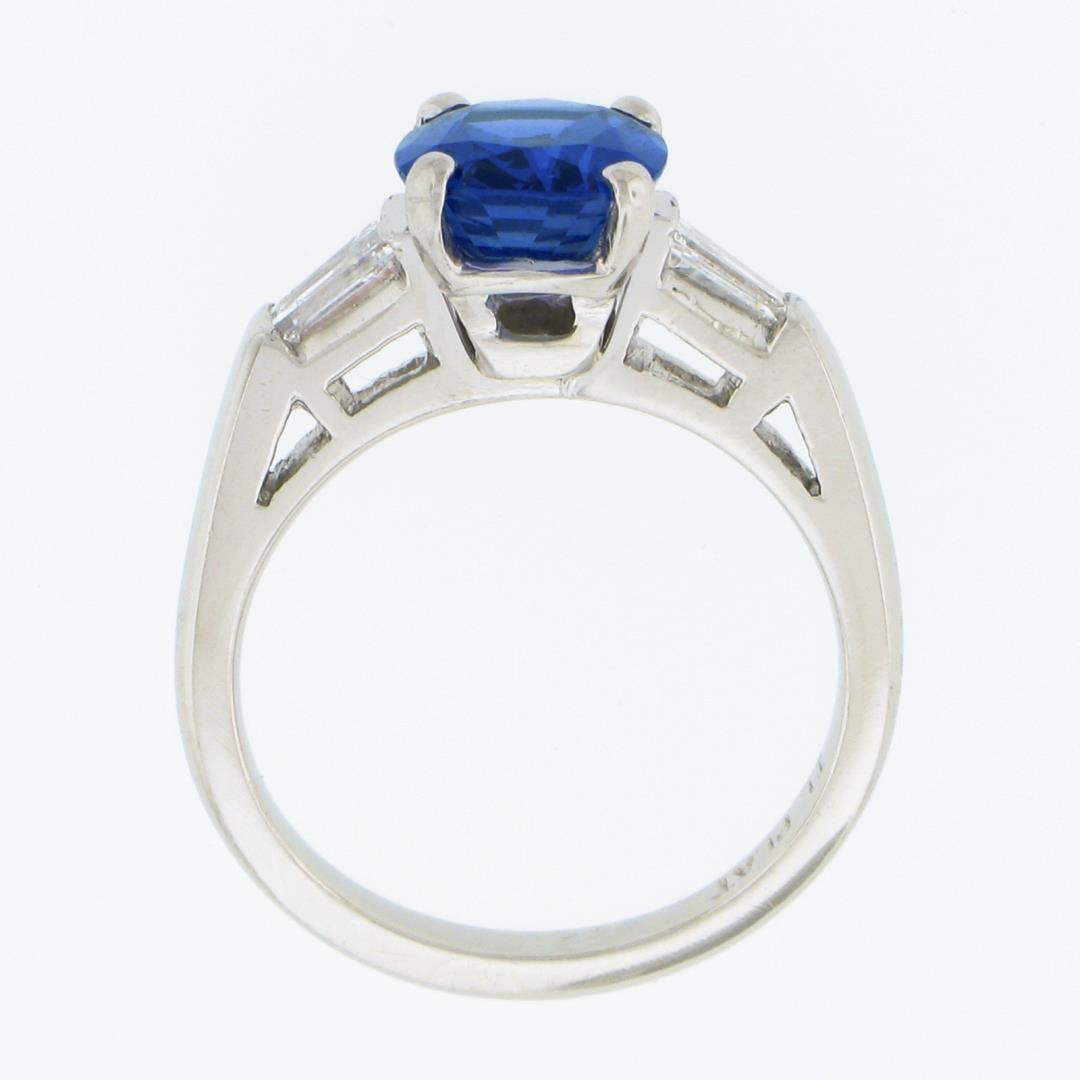 A vintage platinum engagement ring, with 1 GIA graded cushion cut natural sapphire (2.46ct), and 2 tapered baguette cut natural diamonds (F/G - VS1/VS2 ; 0.50ctw). The ring is size 4.5, weighs a total of 7.09 grams, and measures 8.92mm wide. Comes with all original relevant certifications.
