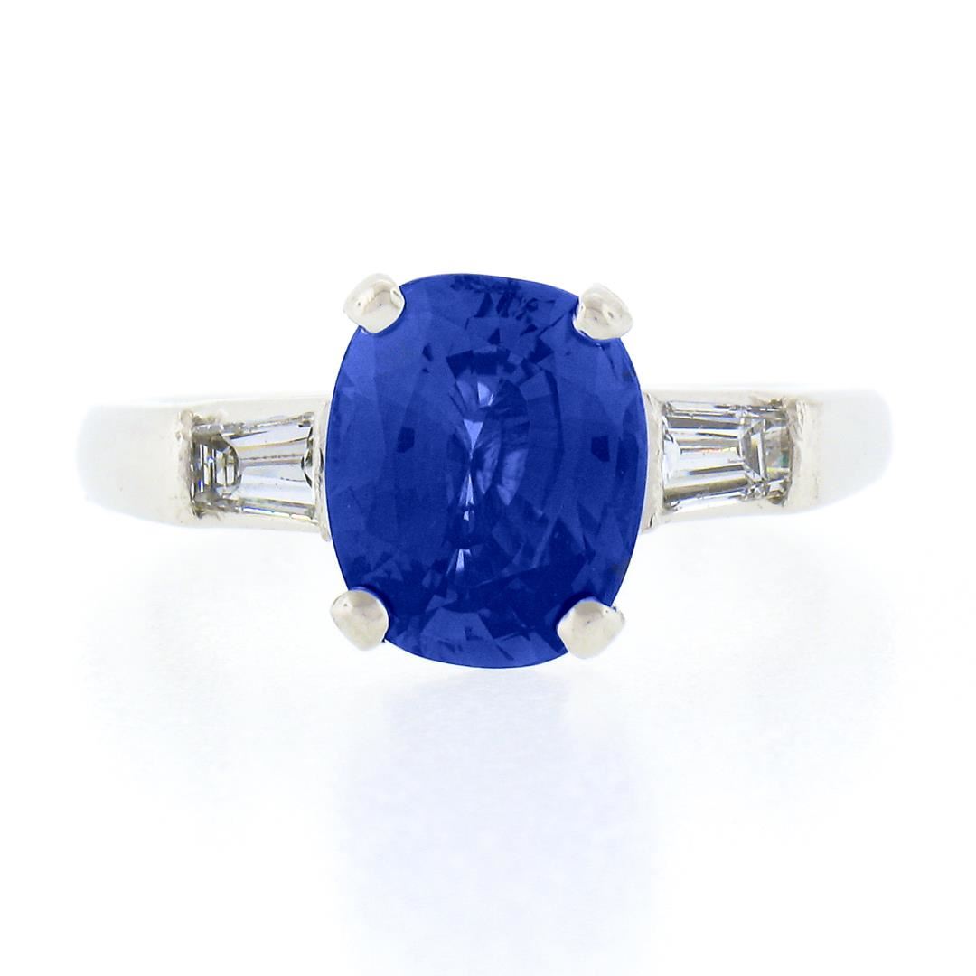 A vintage platinum engagement ring, with 1 GIA graded cushion cut natural sapphire (2.46ct), and 2 tapered baguette cut natural diamonds (F/G - VS1/VS2 ; 0.50ctw). The ring is size 4.5, weighs a total of 7.09 grams, and measures 8.92mm wide. Comes with all original relevant certifications.