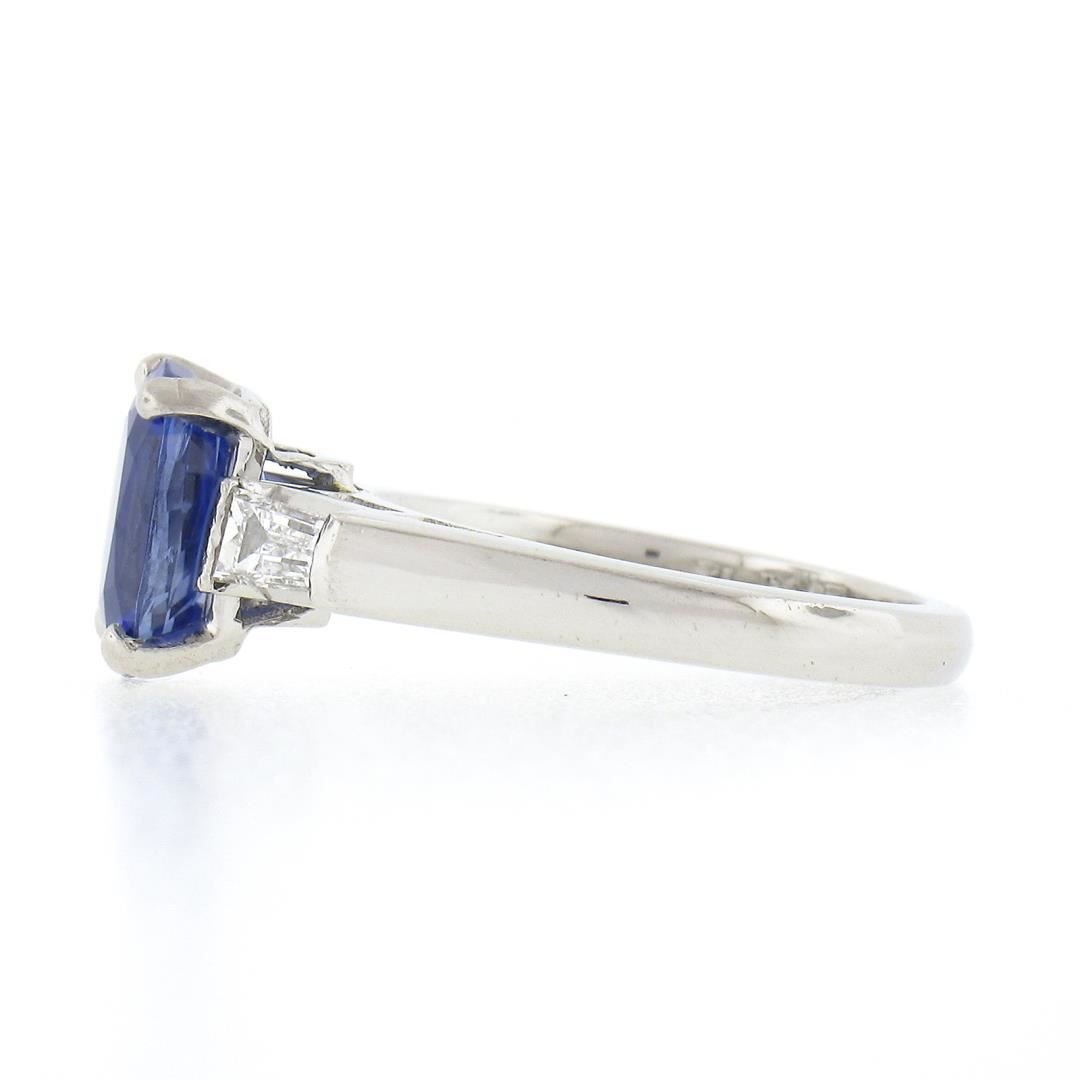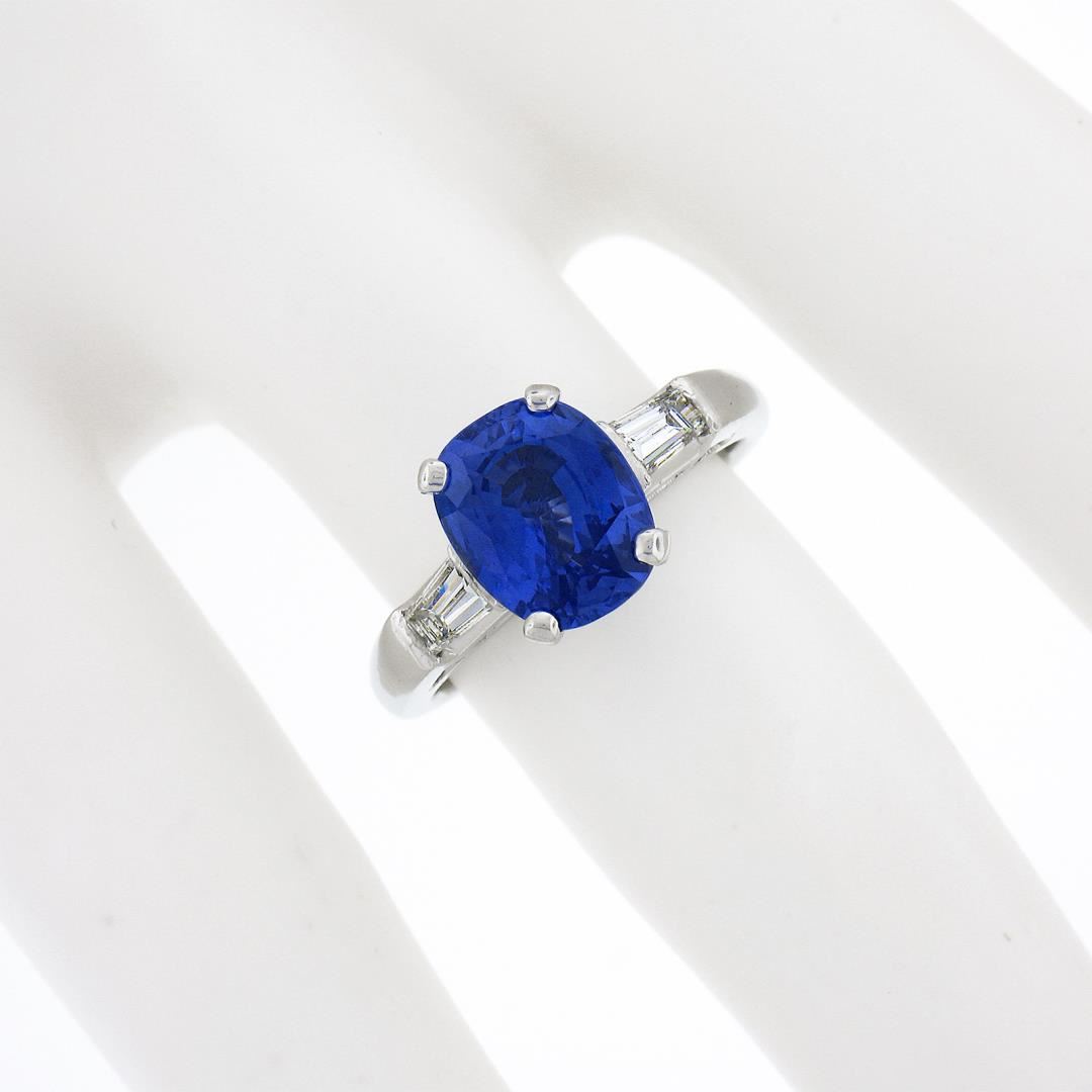 A vintage platinum engagement ring, with 1 GIA graded cushion cut natural sapphire (2.46ct), and 2 tapered baguette cut natural diamonds (F/G - VS1/VS2 ; 0.50ctw). The ring is size 4.5, weighs a total of 7.09 grams, and measures 8.92mm wide. Comes with all original relevant certifications.