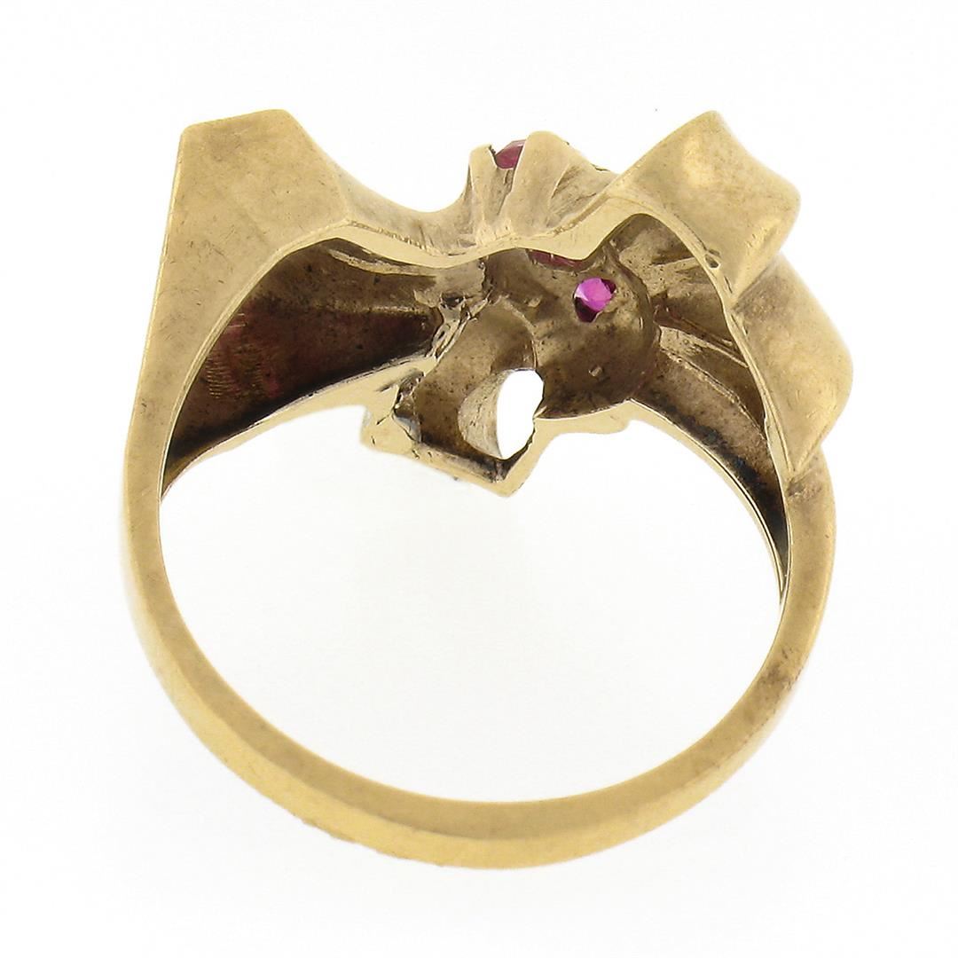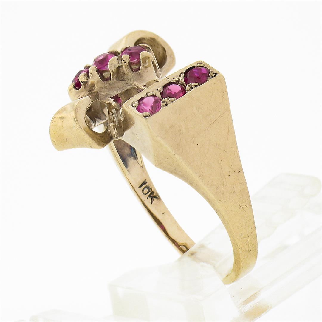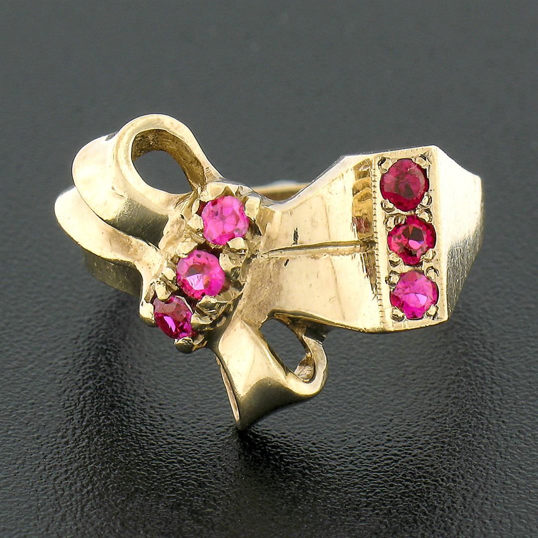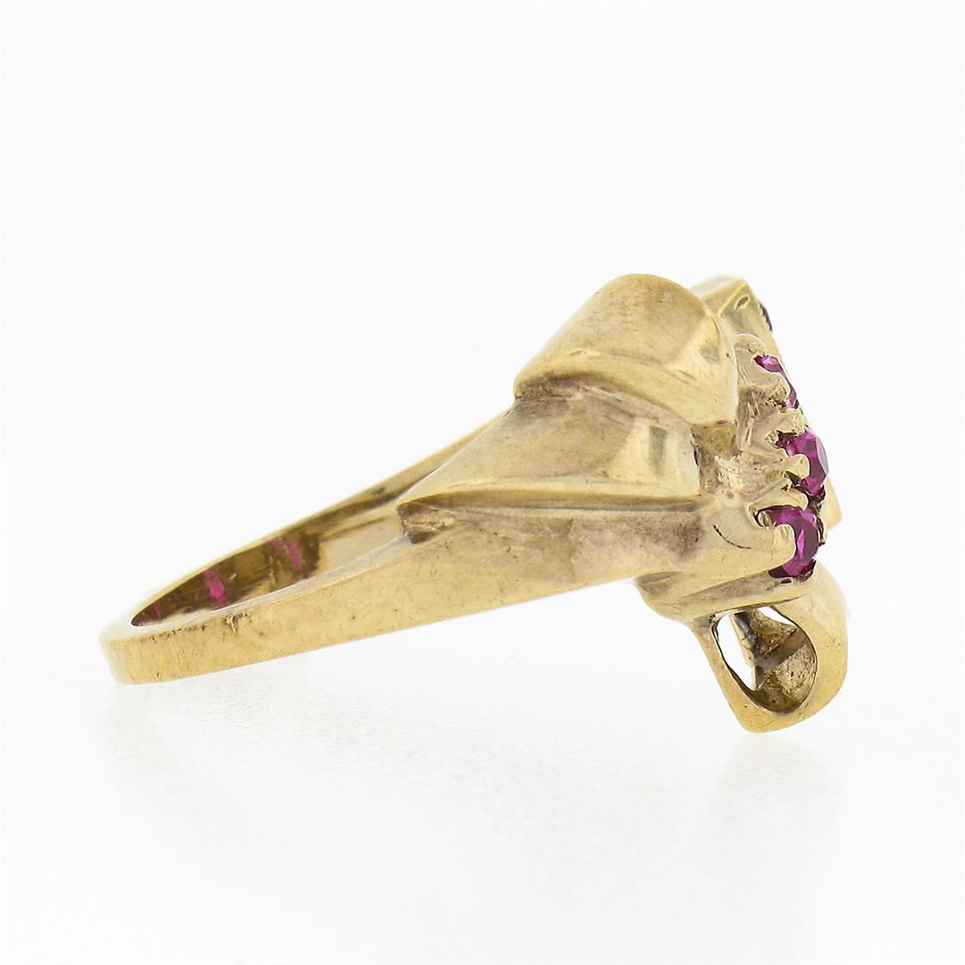 A vintage solid 10k yellow gold bow ring, with 6 round cut red stones (2.25mm each). The ring is size 5.5, weighs a total of 3.19 grams, and measures 14.40mm wide.