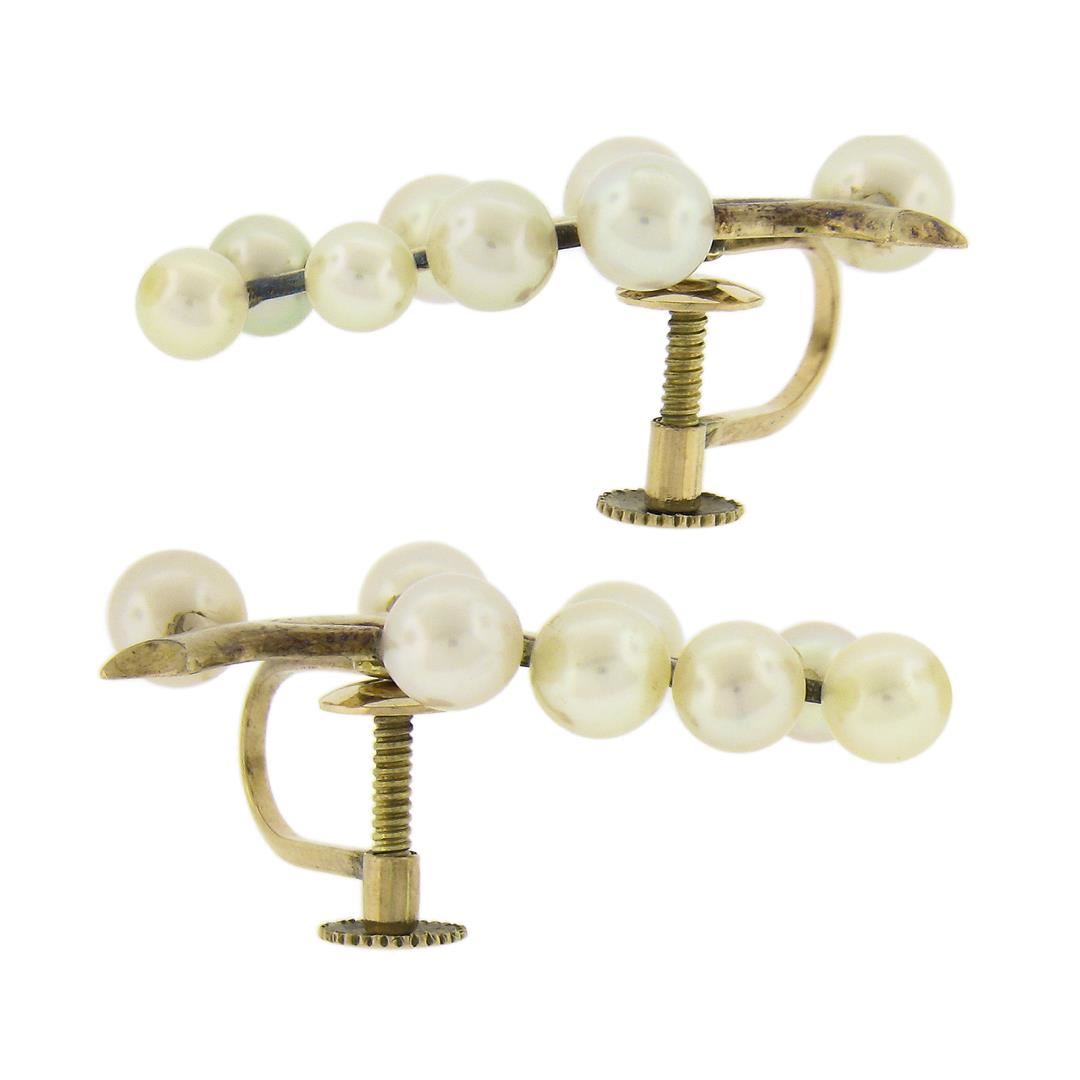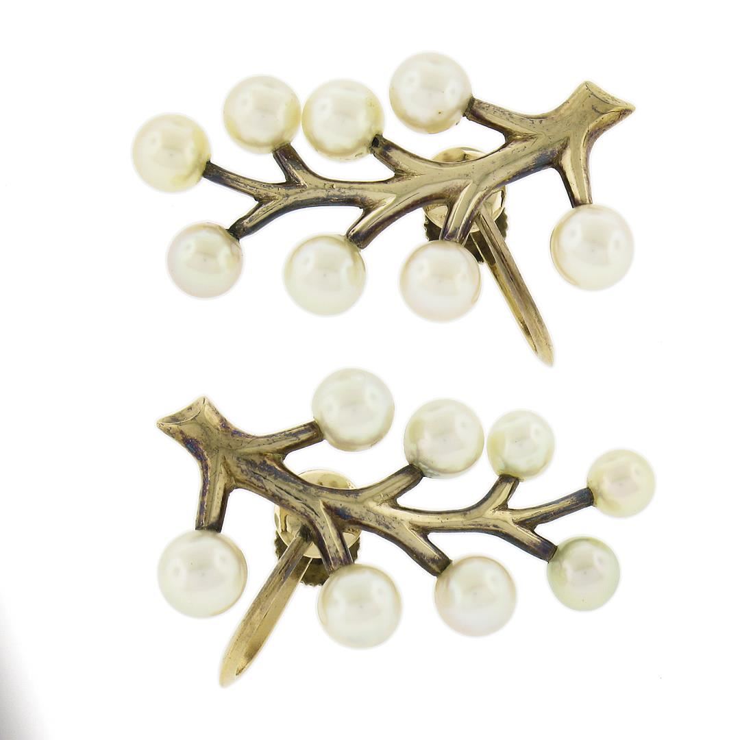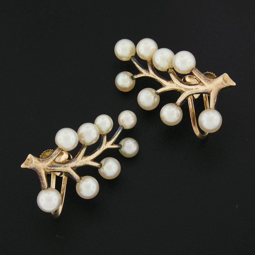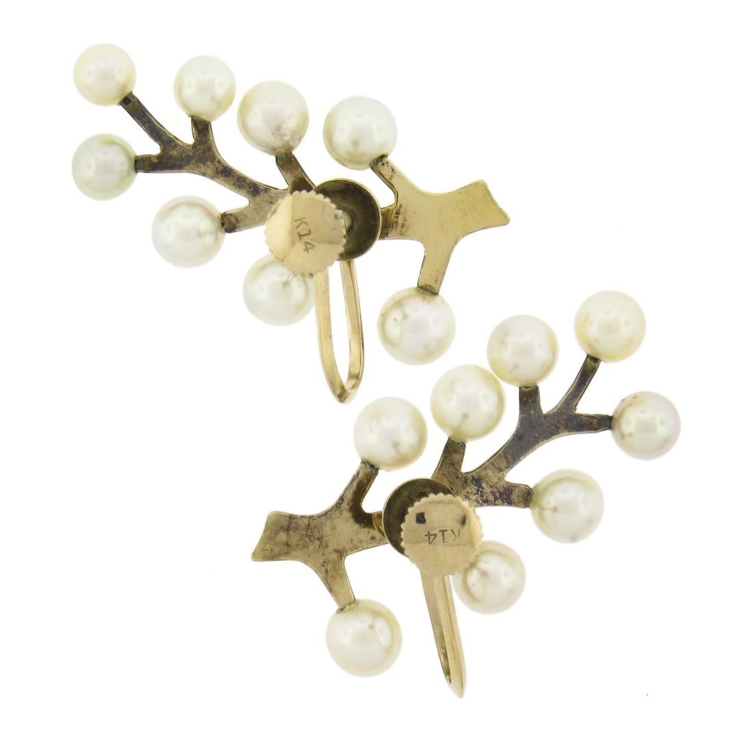 A vintage solid 14k rosy yellow gold branch earrings, with 16 round shape cultured pearls (3.75 to 4.75mm ). The earrings measure approximately 30x26mm and weigh a total of 4.80 grams.