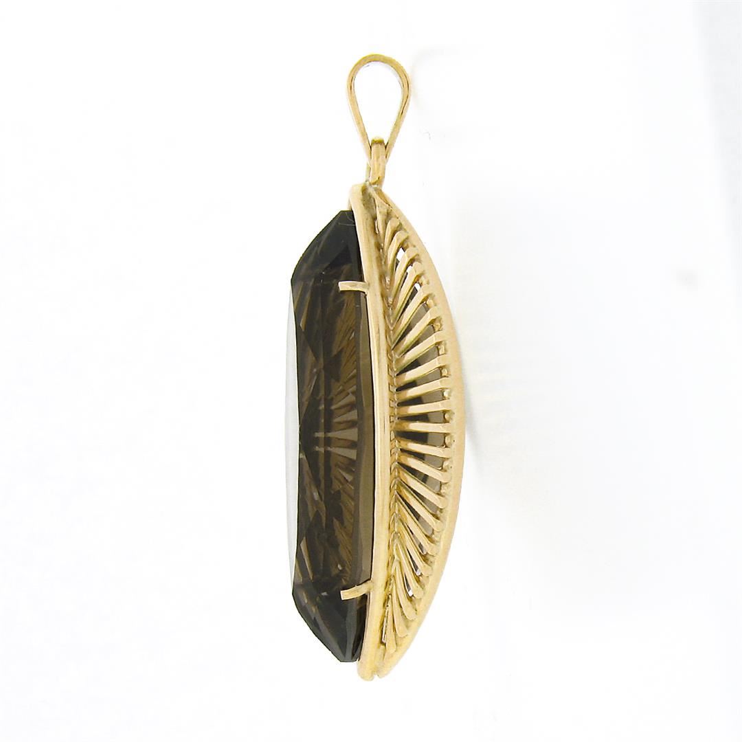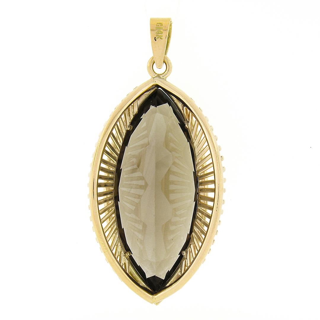 A solid 14k rosy yellow gold handmade open wire large pendant, with 1 marquise cut natural smoky quartz (37.85x17.0mm). The pendant weighs a total of 17.27 grams, measures 52.20x24.70mm including the bail, and the inside of the bail measures 6x3.9mm.
