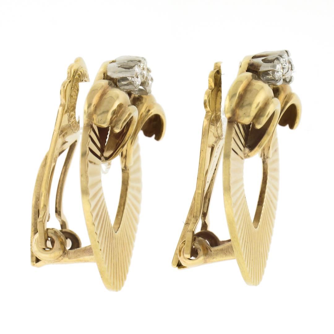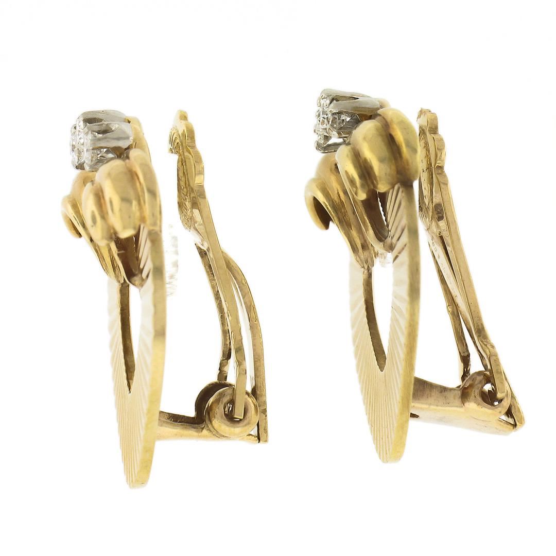 A vintage retro solid 14k yellow gold and platinum clip on earrings, with 6 round cut natural diamonds (F/G - VS1/VS2 ; 0.18ctw). The earrings measure approximately 22x21.5mm and weigh a total of 10.01 grams
