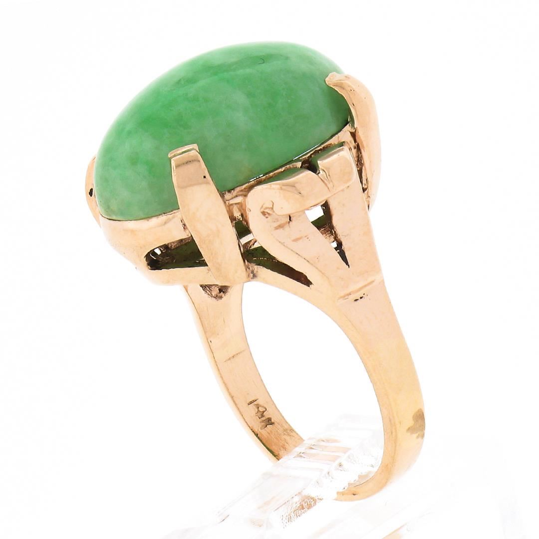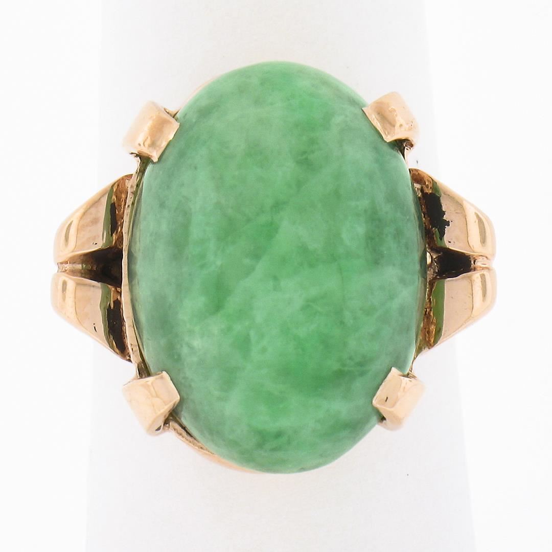 A vintage solid 14k yellow gold ring, with 1 oval cabochon cut natural mebled jade (17.9x13mm). The ring is size 6.0, weighs a total of 8.59 grams, and measures 17.9mm wide.