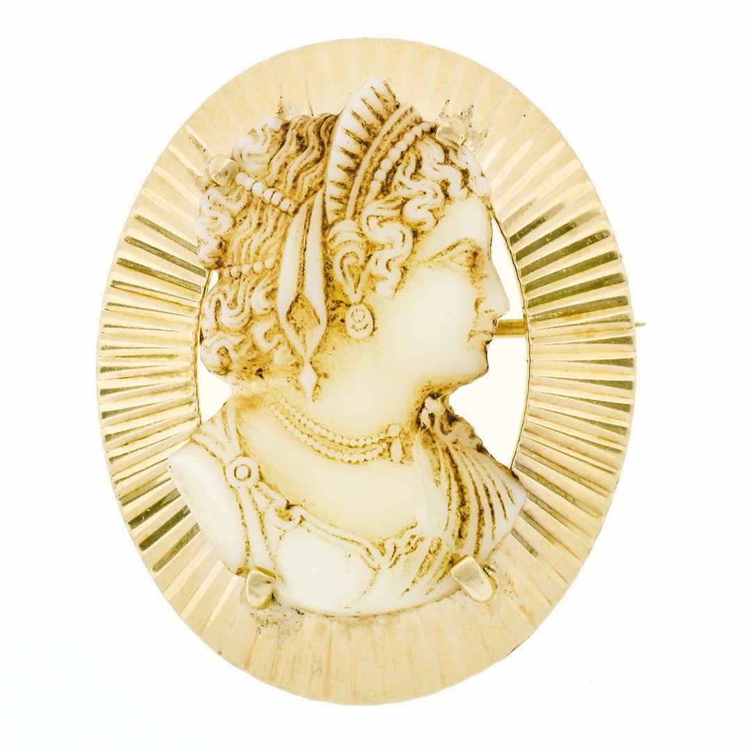 A retro vintage solid 14k rosy yellow gold fluted brooch with 1 white carved shell (29.75x19.4mm). Measures 37x29.9mm and weighs a total of 8.0 grams.