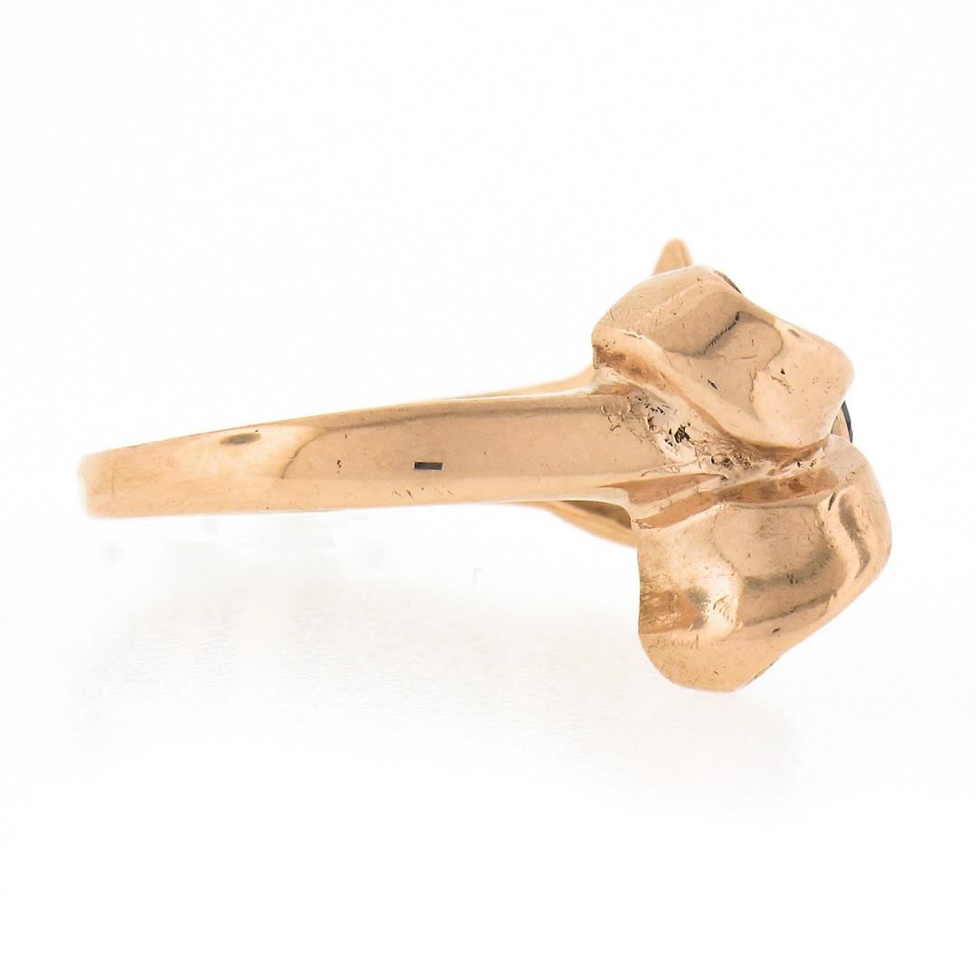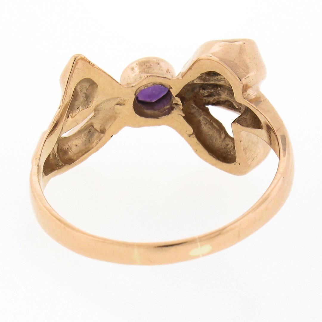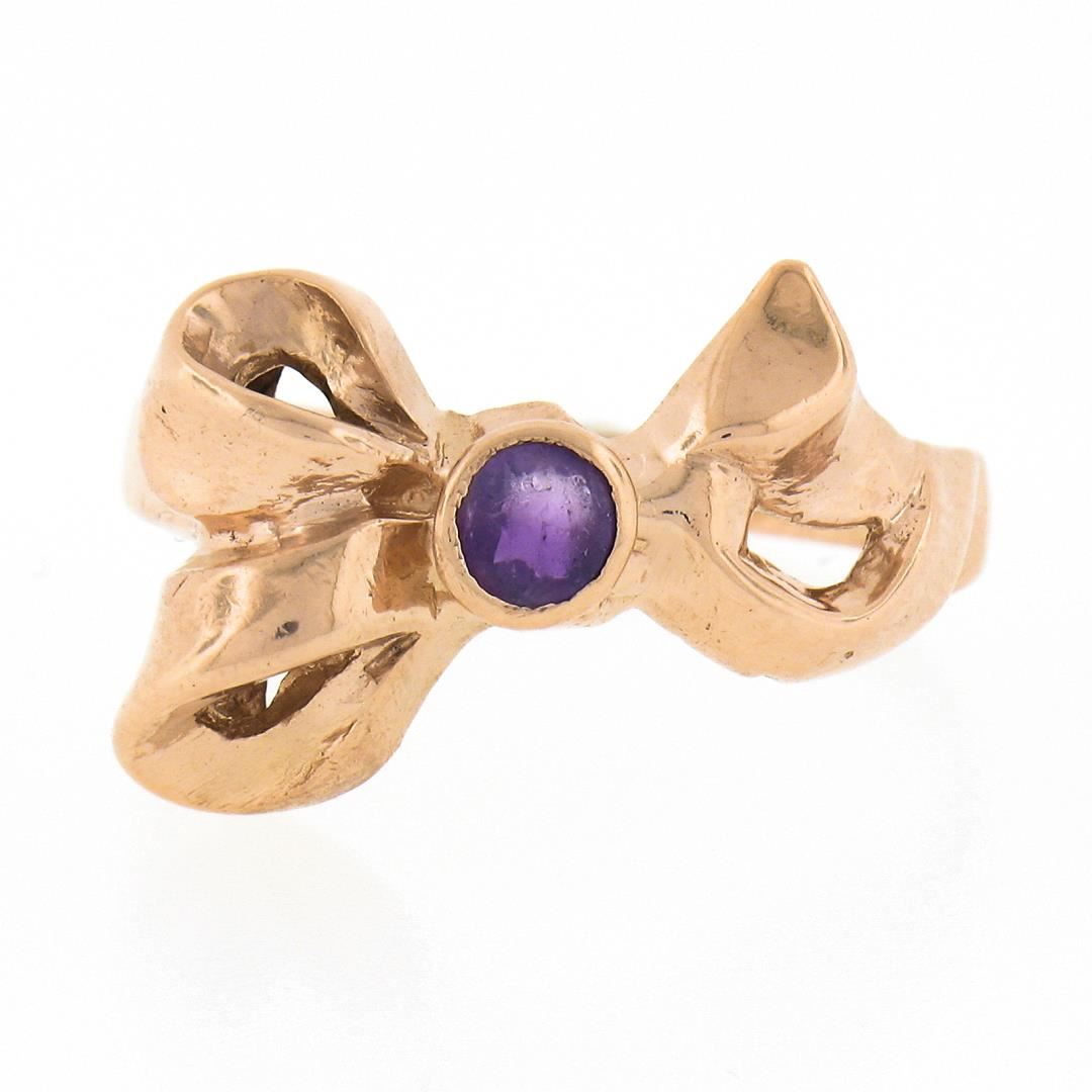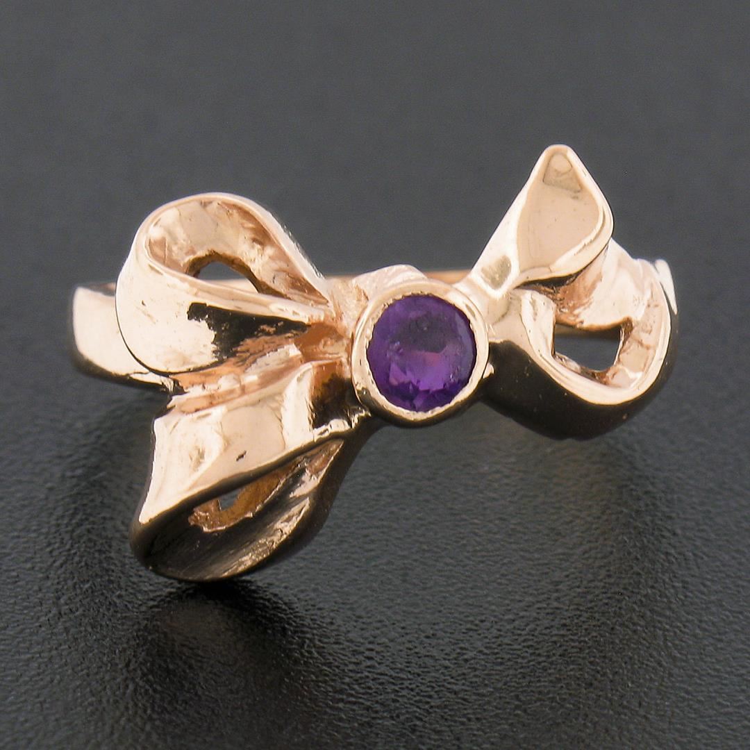 A vintage retro solid 14k rose gold ribbon ring, with 1 round cut natural amethyst (3.3mm). The ring is size 7.5, weighs a total of 3.91 grams, and measures 12.1mm wide.