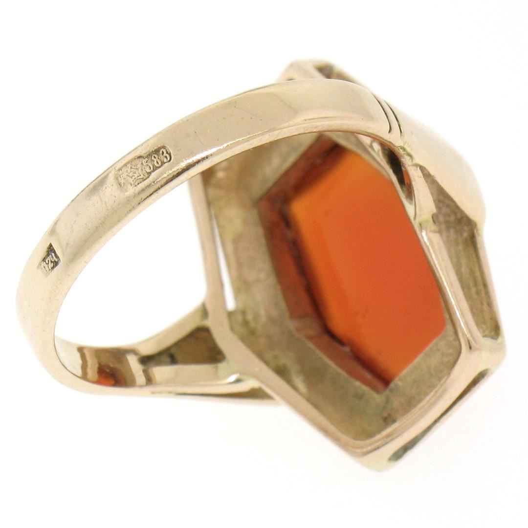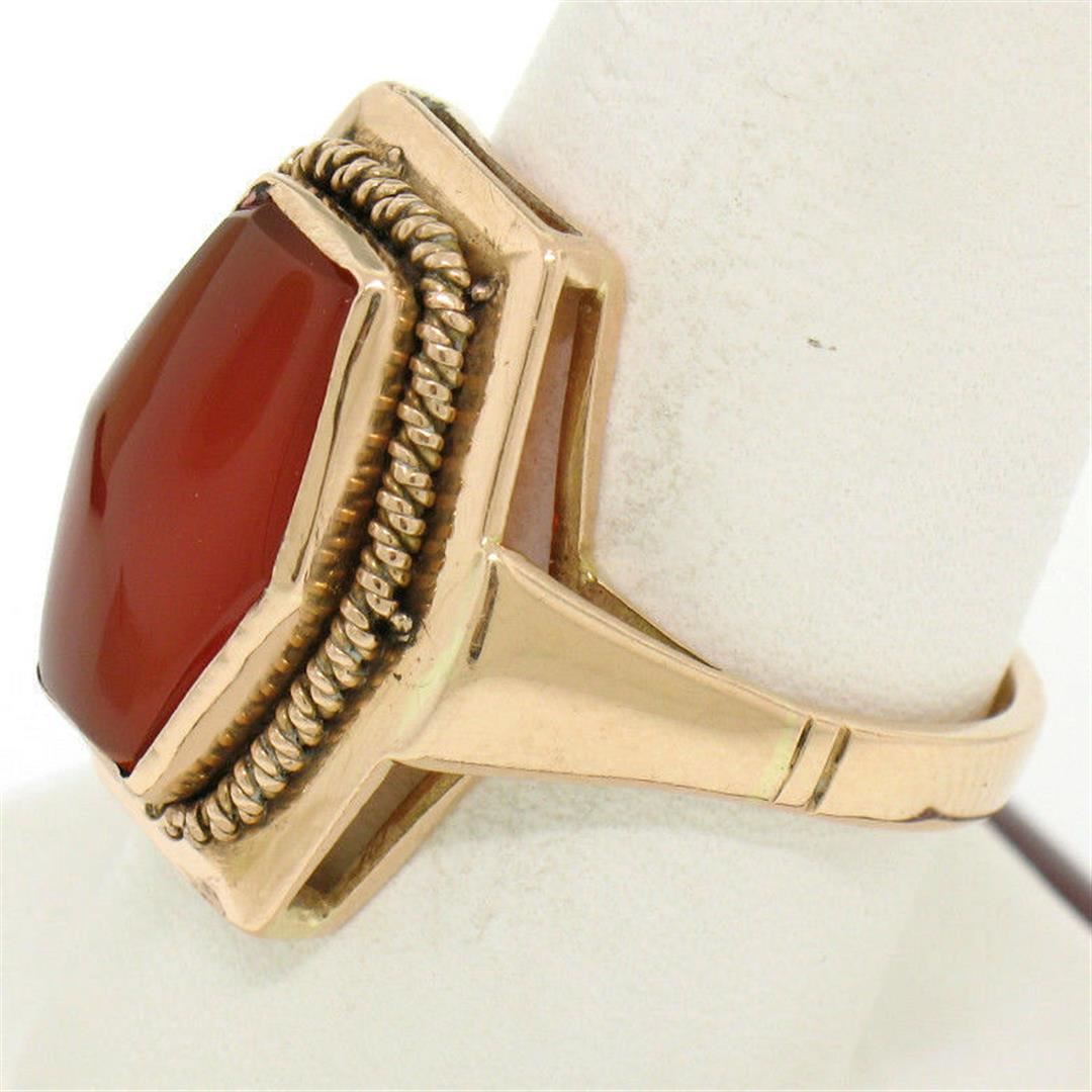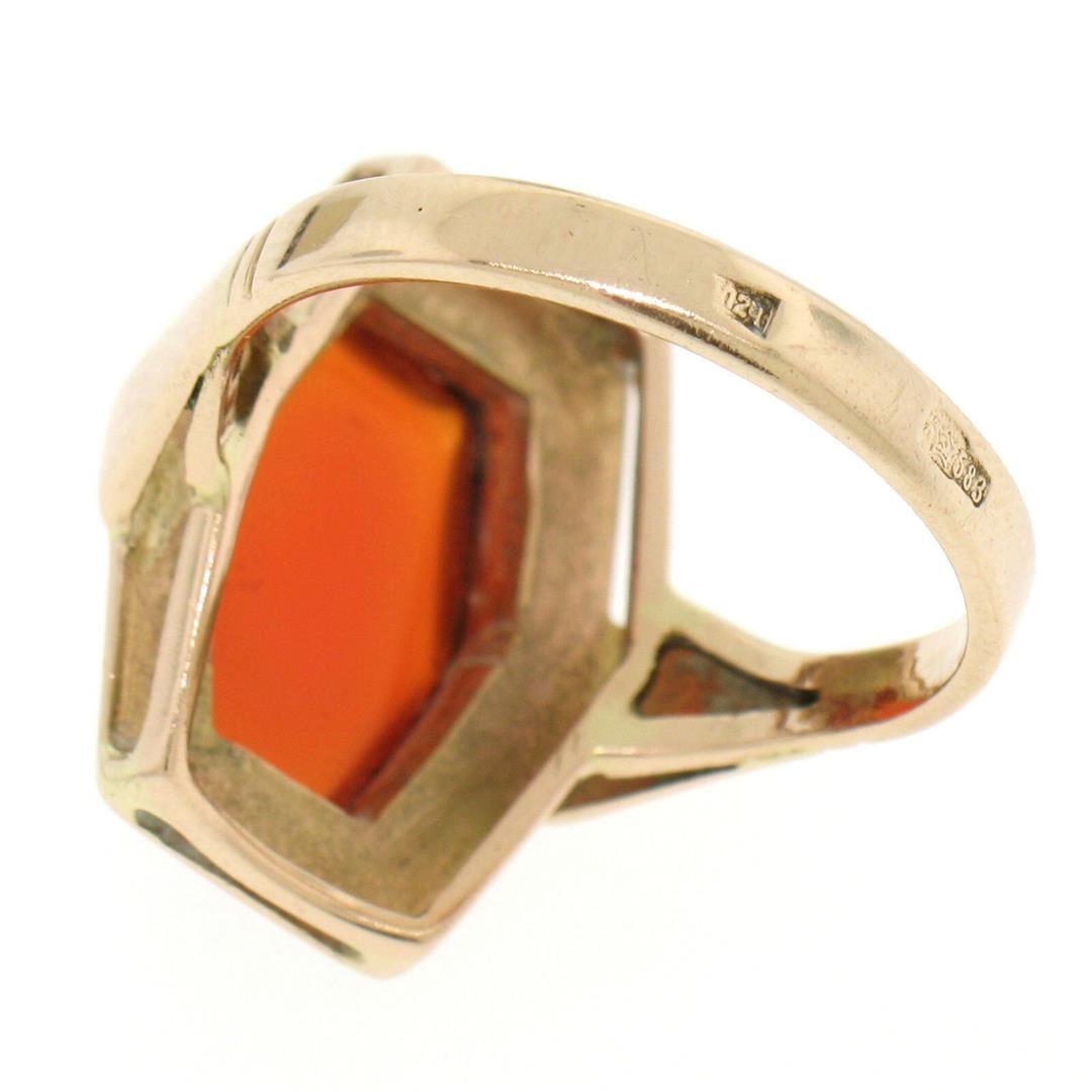 An excellent condition, vintage, Russian-made ring bezel set with a hexagonal cabochon cut carnelian measuring 14.0x9.25mm. The ring is a size 9, weighs a total of 7.10 grams, and is 20.15mm wide.