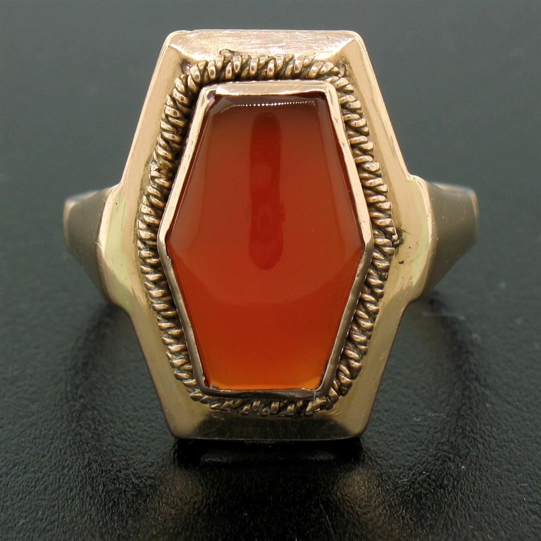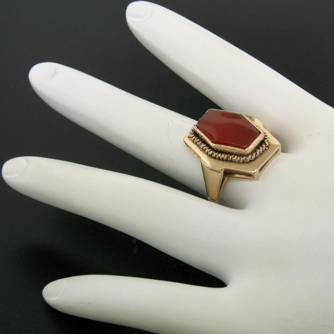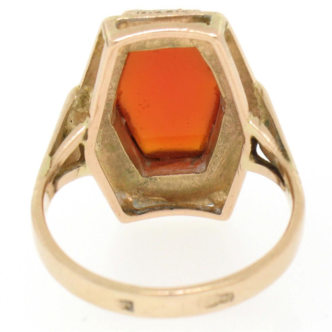 An excellent condition, vintage, Russian-made ring bezel set with a hexagonal cabochon cut carnelian measuring 14.0x9.25mm. The ring is a size 9, weighs a total of 7.10 grams, and is 20.15mm wide.