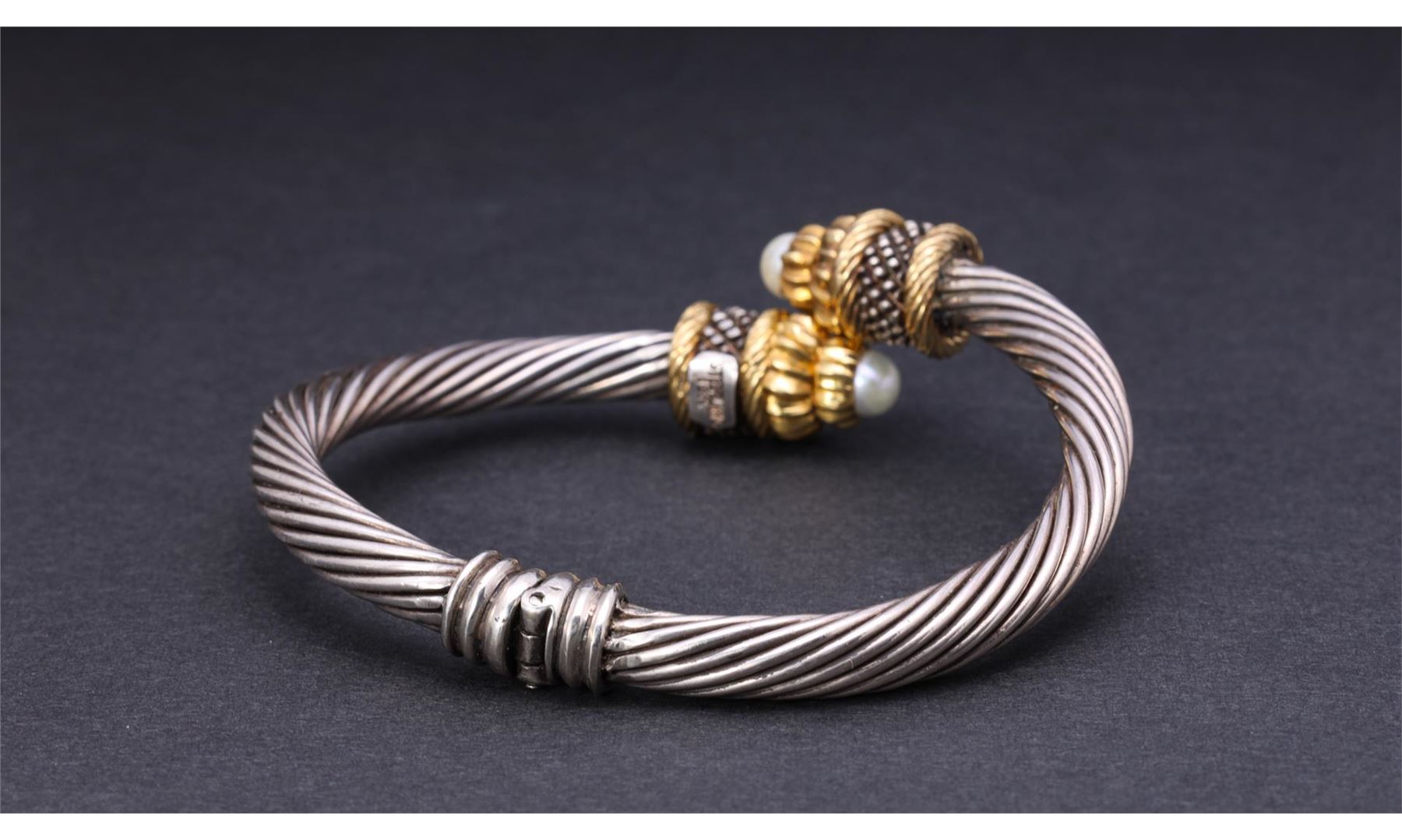 Vintage Sterling Silver & 18K Gold Crossover Bracelet with Natural Pearls. Total weight is 36 gm. Estimated retail value $1,200.