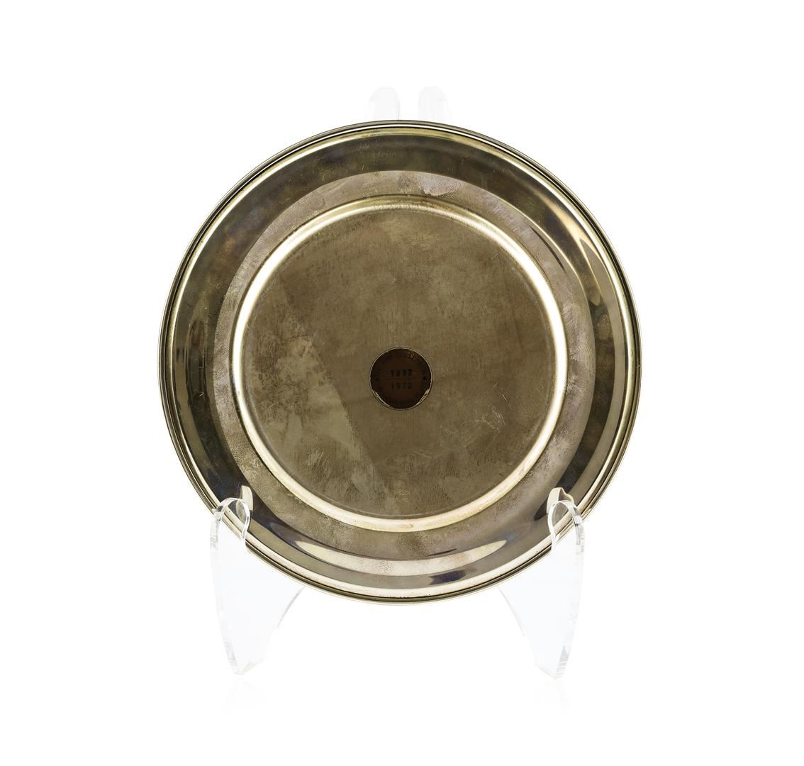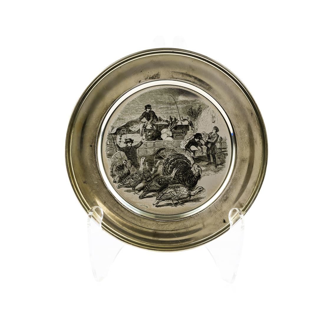 One vintage sterling silver "Thanksgiving Plate" by the Kirk Collection. The plate features turkeys and is hallmarked on the back 1972 S. Kirk + Son, Sterling, 1232/1972. Vintage condition with the original patina and original Kirk sticker still attached on the back. Measures eight inches.