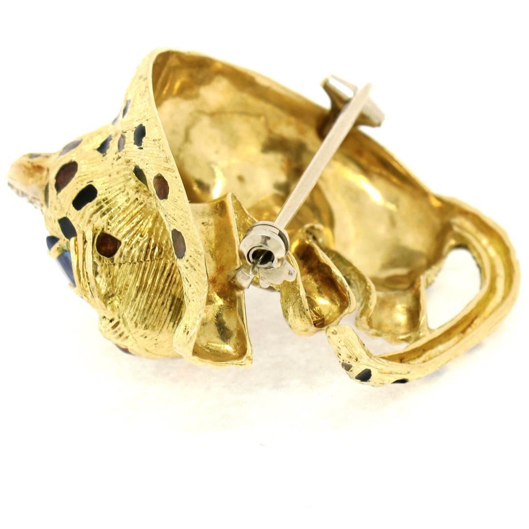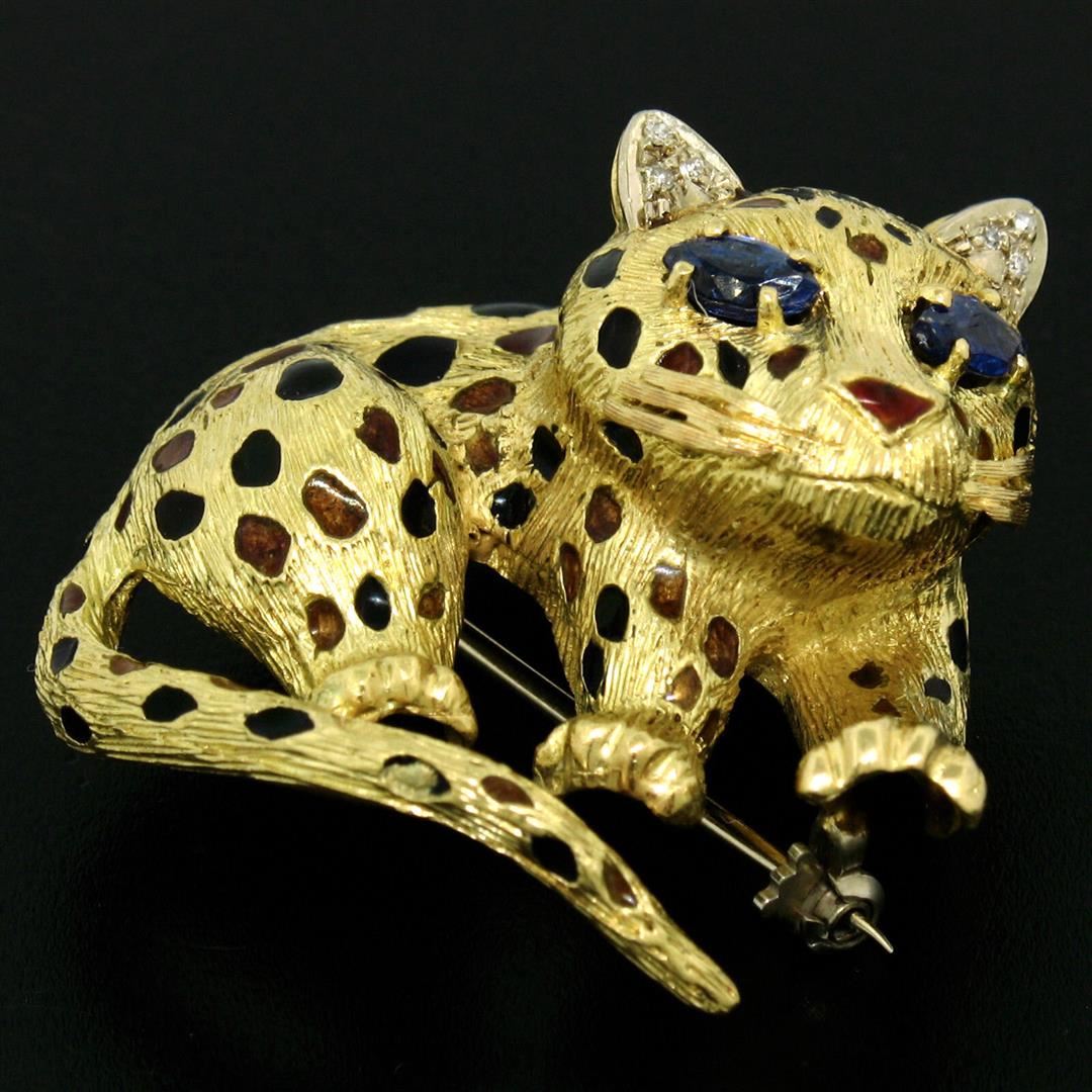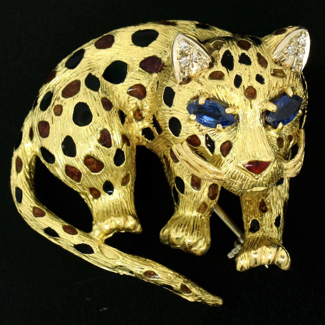 A vintage solid 18k yellow gold and enamel leopard brooch, featuring 2 marquise cut natural sapphires (0.60ctw), and 6 round single cut natural diamonds (G - VS2; 0.06ctw). Measures 40.70x37.10mm and weighs a total of 21.66 grams.