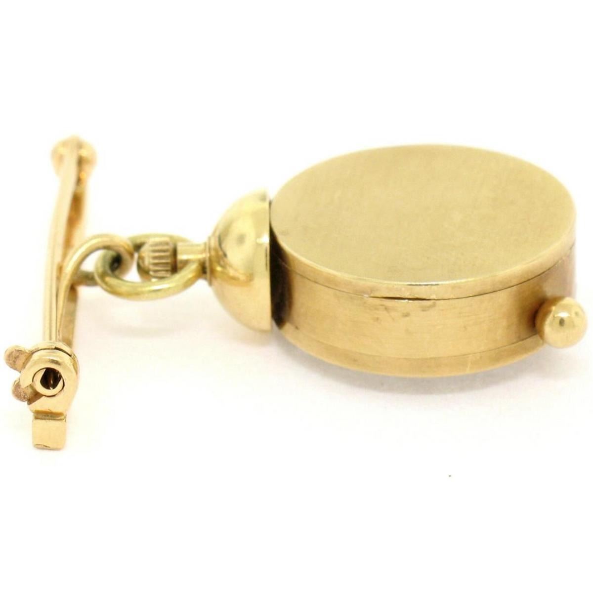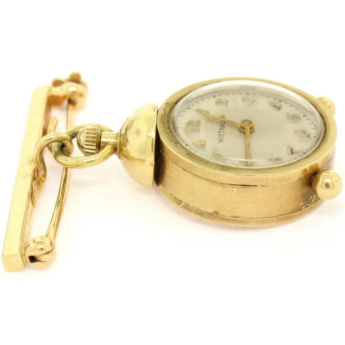 One Vintage Unique 14K Yellow Gold Wittnauer 17 Jewel Mechanical Watch Pin Brooch. Item Details: Material: 14K Solid Yellow Gold, Total Weight: 14.53 Grams, Movement: Swiss Made - Mechanical - Hand Winding - 17 Jewels, Overall Height: 33.10mm, Overall Width: 32.05mm (pin), 18.58mm (watch), Overall Thickness: 8.00mm, Inside Backing Engraving: Wittnauer, Watch Co. Inc. New York 14K Clasp: Pin Back w/ Rotating Lock Condition: Vintage piece. Excellent physical and running condition!