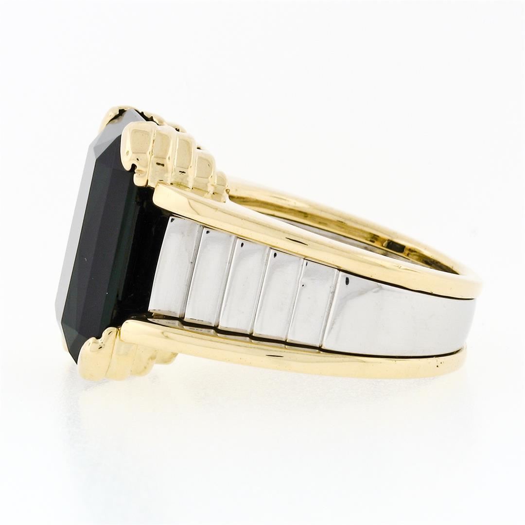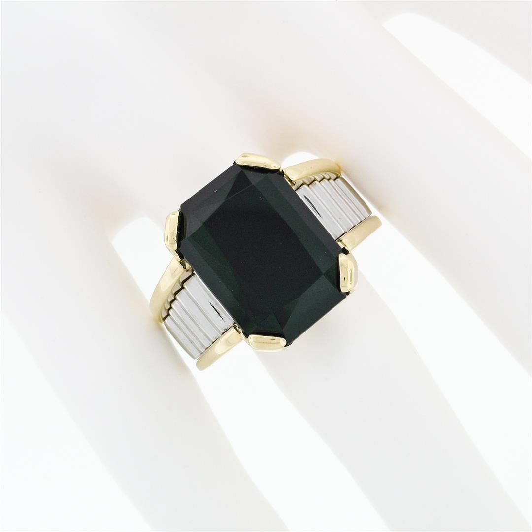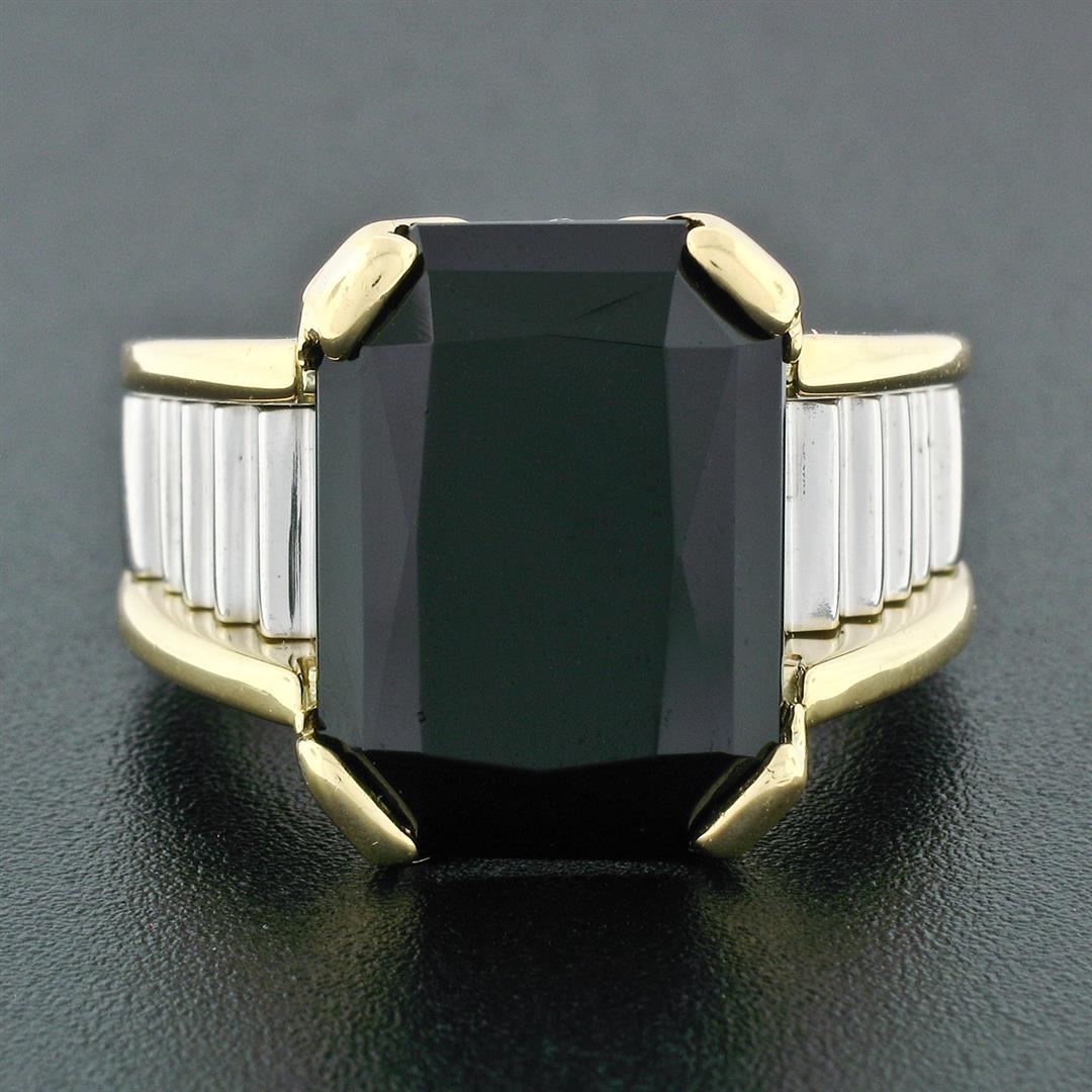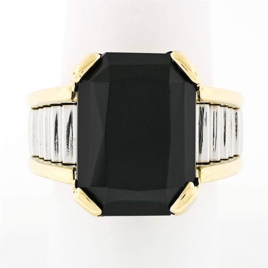 A vintage solid 18k yellow gold & platinum cocktail ring, with 1 rectan gular cut natural black onyx (17.75x12.95mm). The ring is size 9, weighs a total of 26.19 grams, and measures 18mm wide.