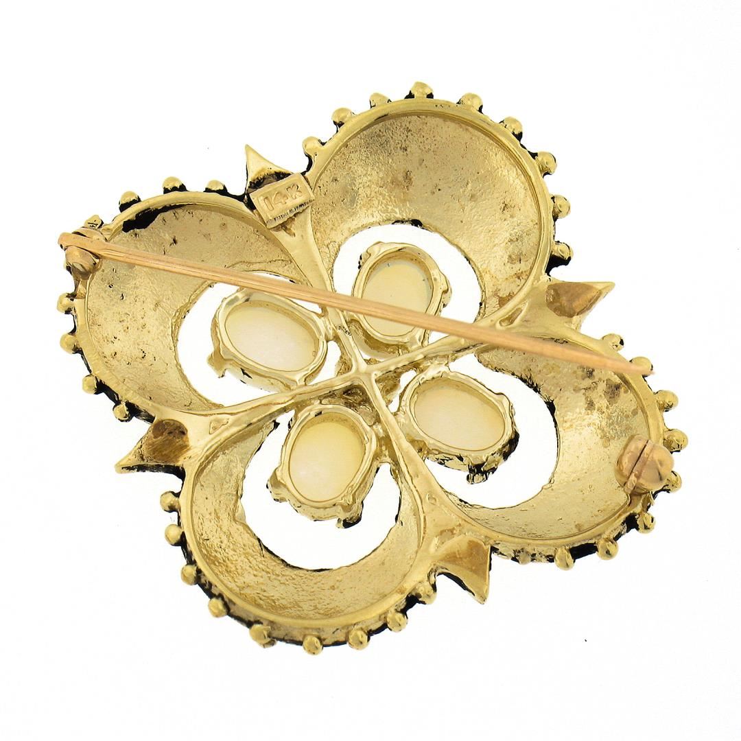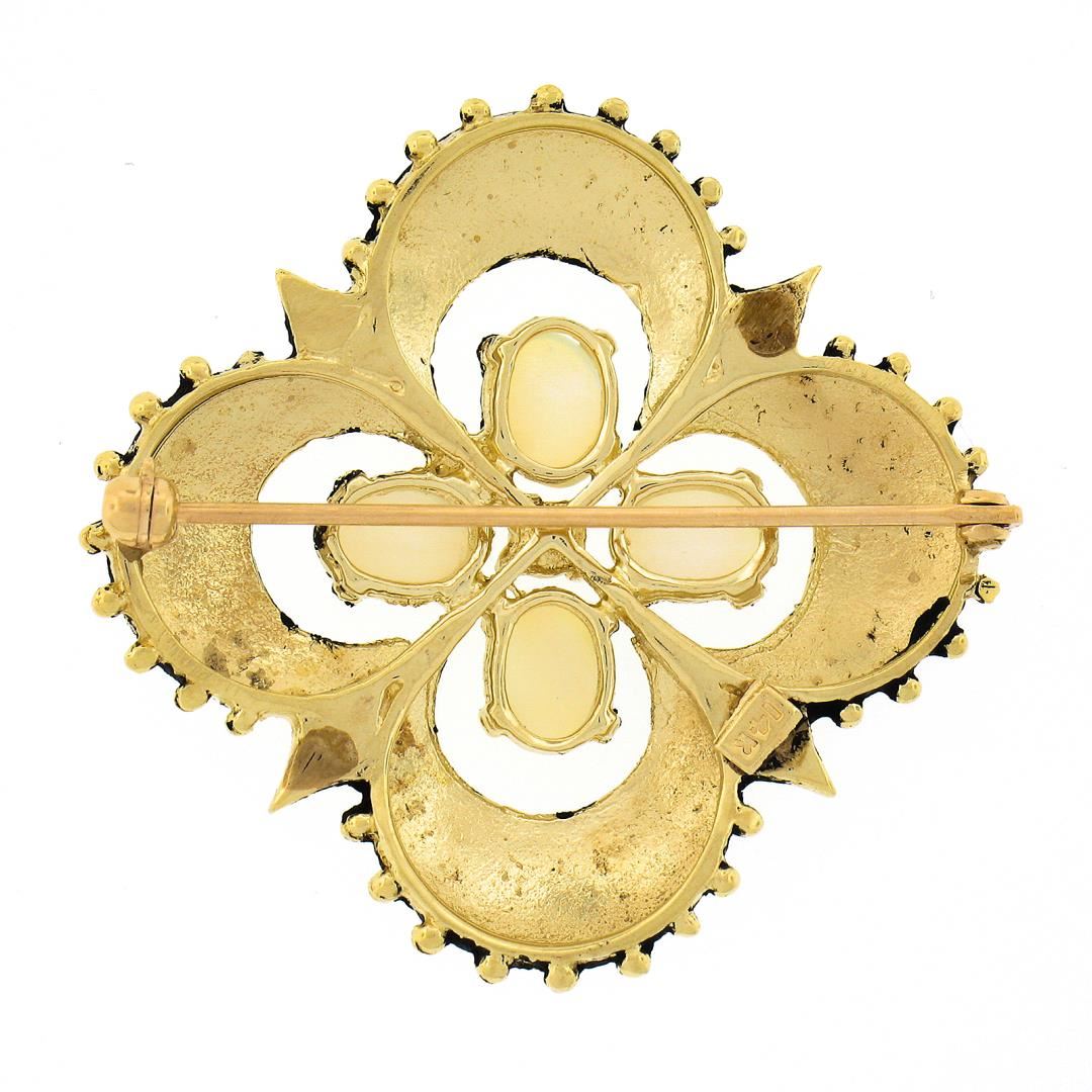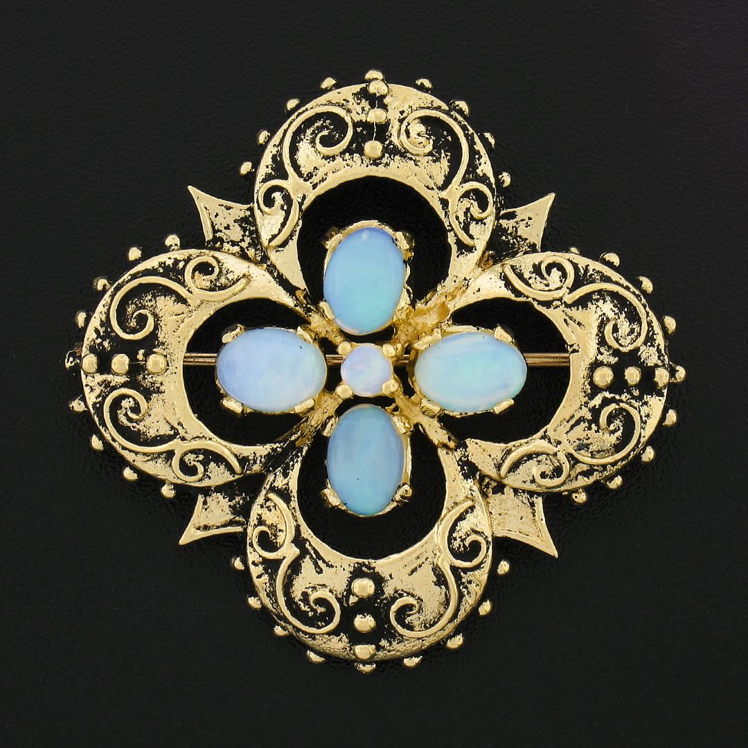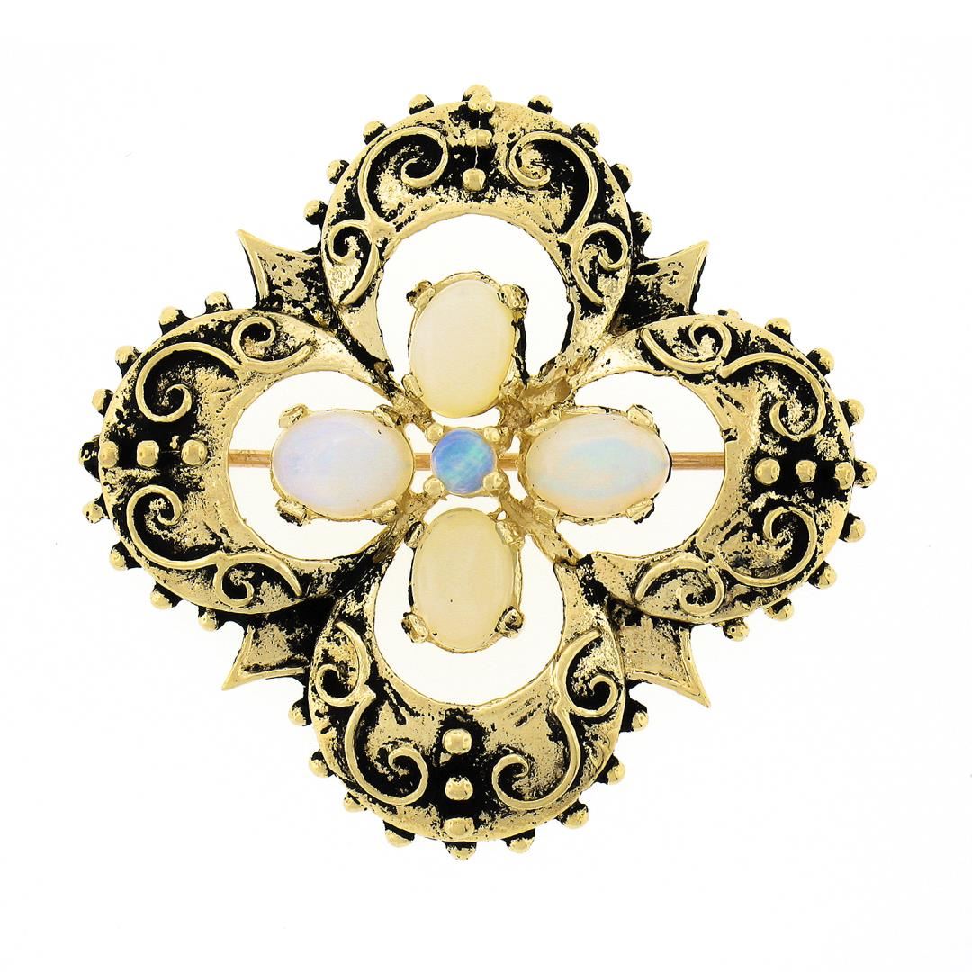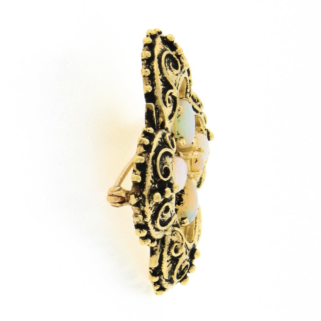 A vintage solid 14k yellow gold brooch, with 1 oval cabochon cut natural opal (3.25mm), and 4 oval cabochon cut natural opals (6.6x5mm each). Measures 38.4x39.3mm and weighs a total of 11.92 grams.