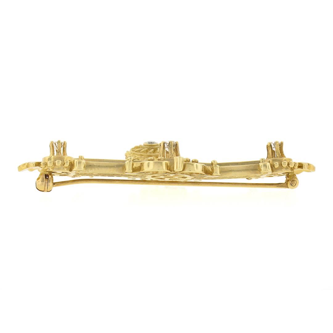 A vintage solid 14k yellow gold brooch, with 4 brilliant cut natural diamonds (F/G - VS1/VS2 ; 0.38ctw). Measures 38.1x58.2mm and weighs a total of 9.87 grams.