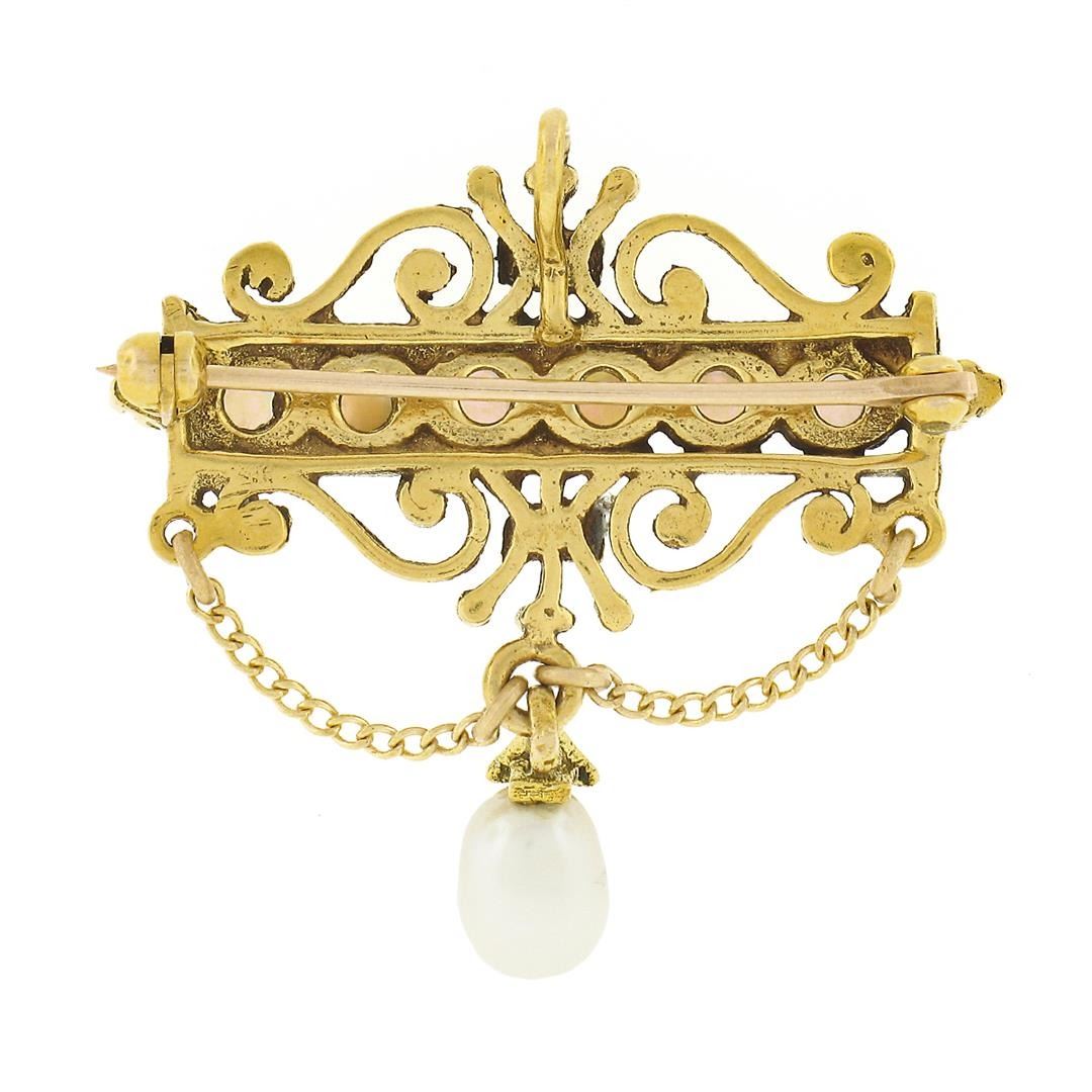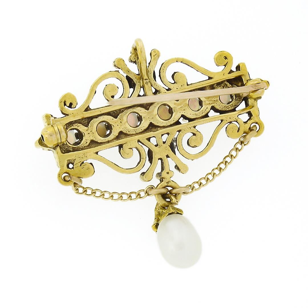 A solid 14k yellow gold dangle brooch pendant, with 6 round cabochon cut natural opals (3mm each), and 1 bead shape cultured seed pearl (1.4mm), with 1 egg shape cultured pearl (7.75x5.65mm). Measures 31.80x32.60mm and weighs a total of 7.66 grams.