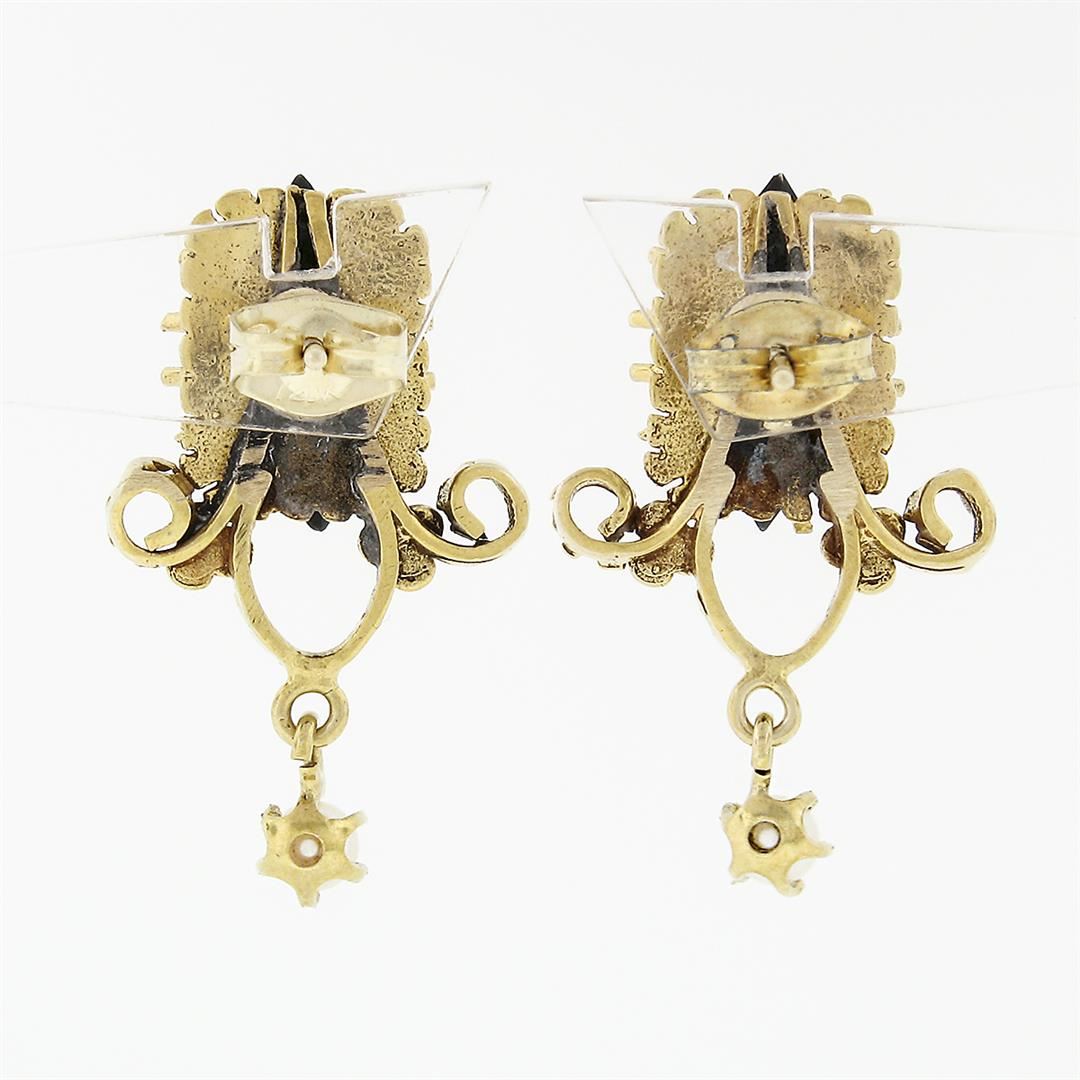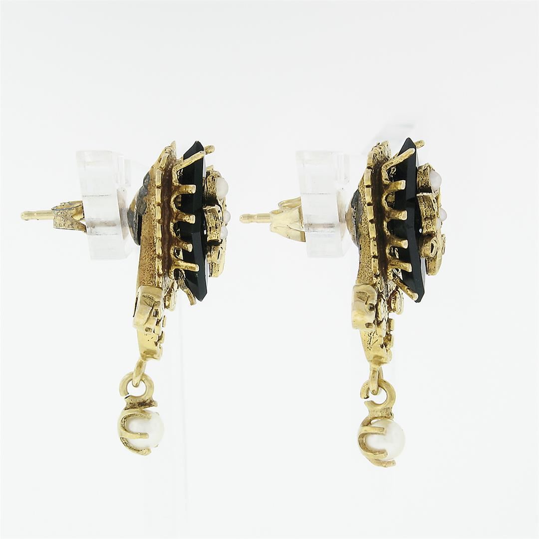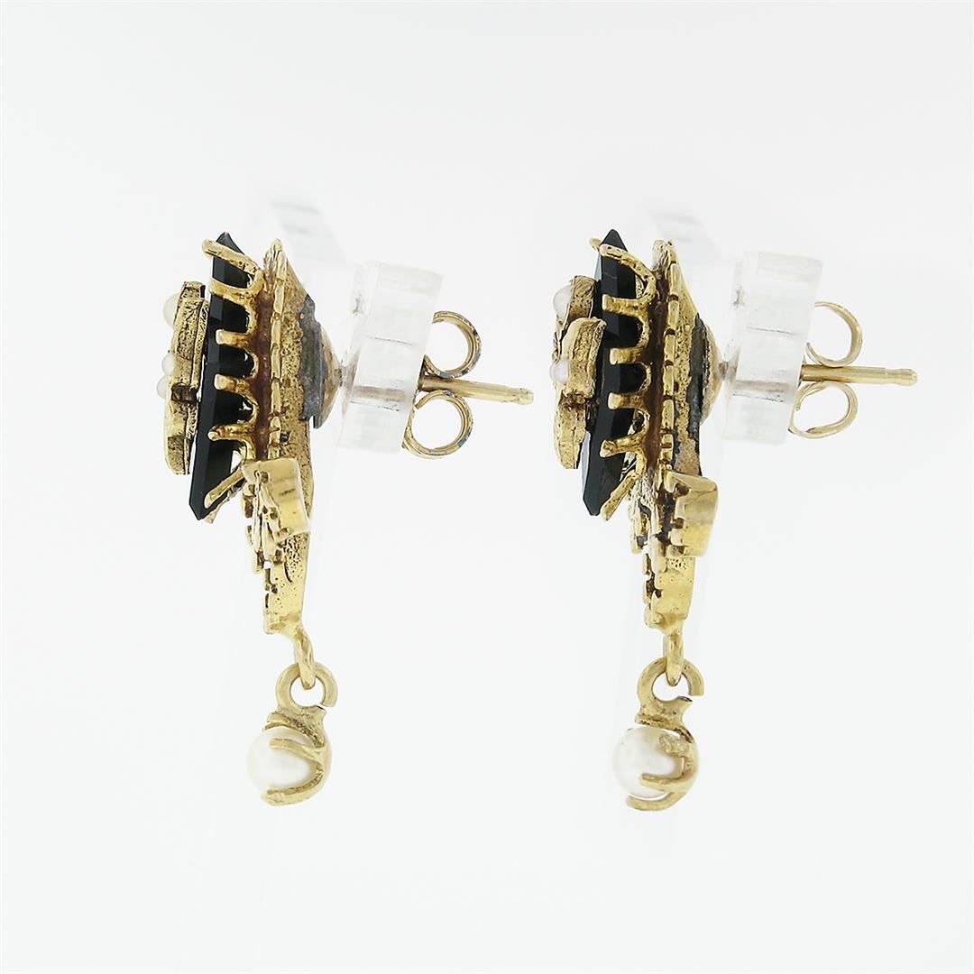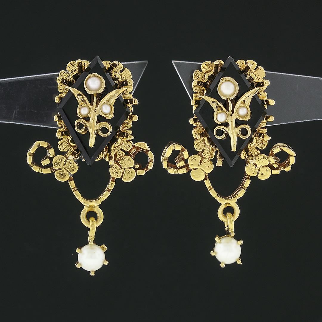 A vintage solid 14k yellow gold dangle earrings, with 2 lozenge cut natural balck onyx (14x9.4mm), and 8 round shape cultured seed pearls (1.3 to 3.5mm ). The earrings measure approximately 28.35x16.35mm and weigh a total of 6.73 grams.
