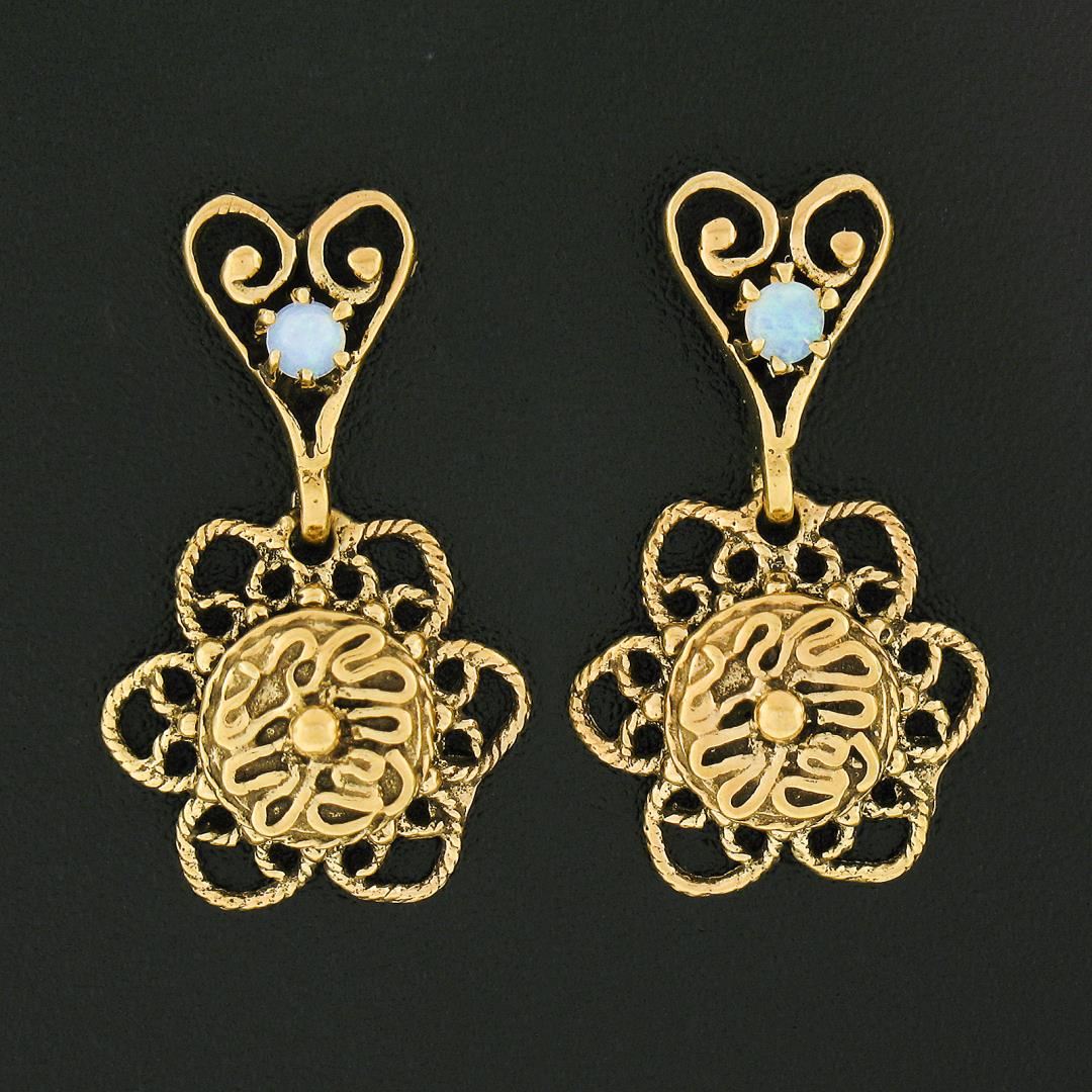 A vintage 14k yellow gold dangle earrings, with 2 round cabochon cut natural opal (2.3mm each). The earrings measure approximately 22.1x13mm and weigh a total of 3.39 grams.