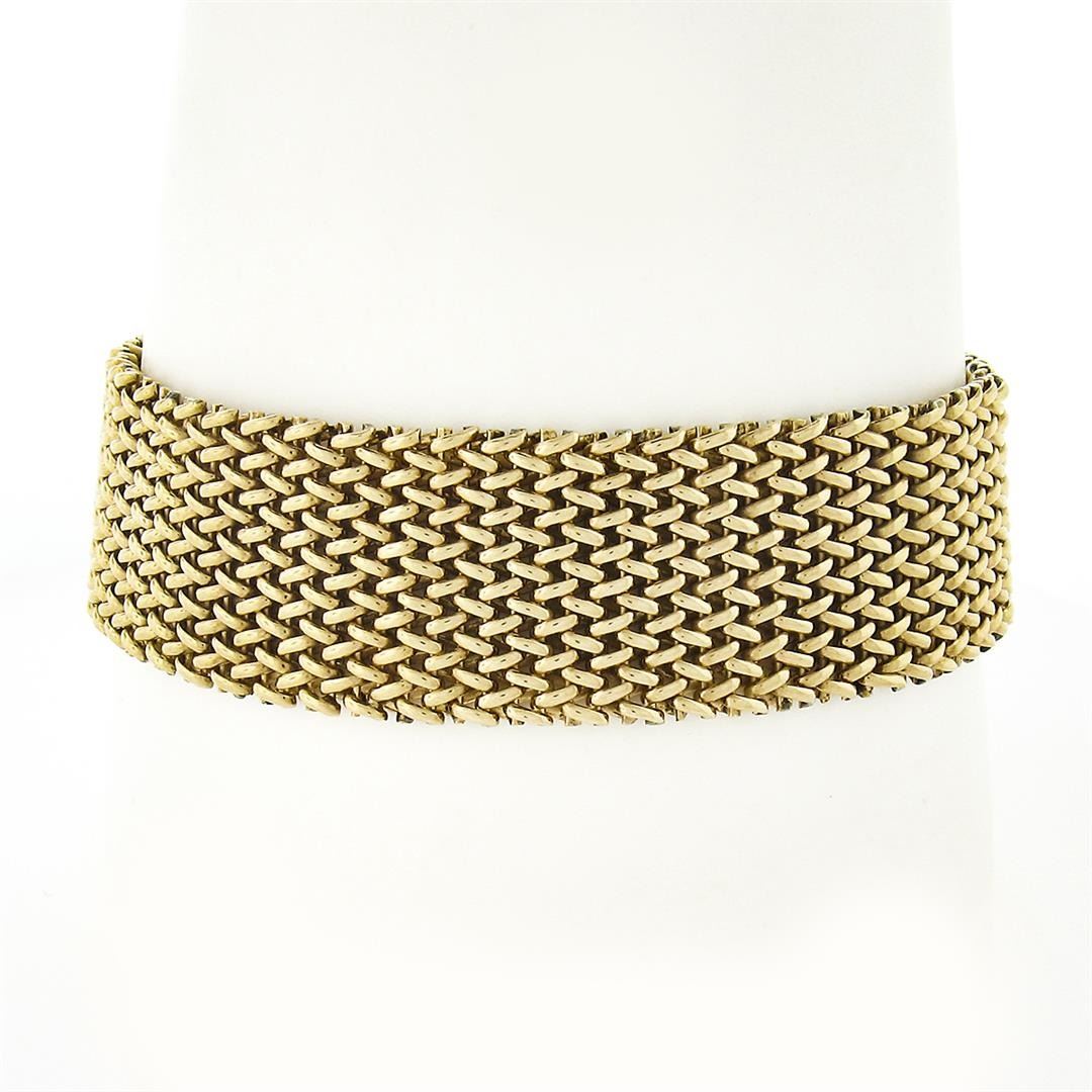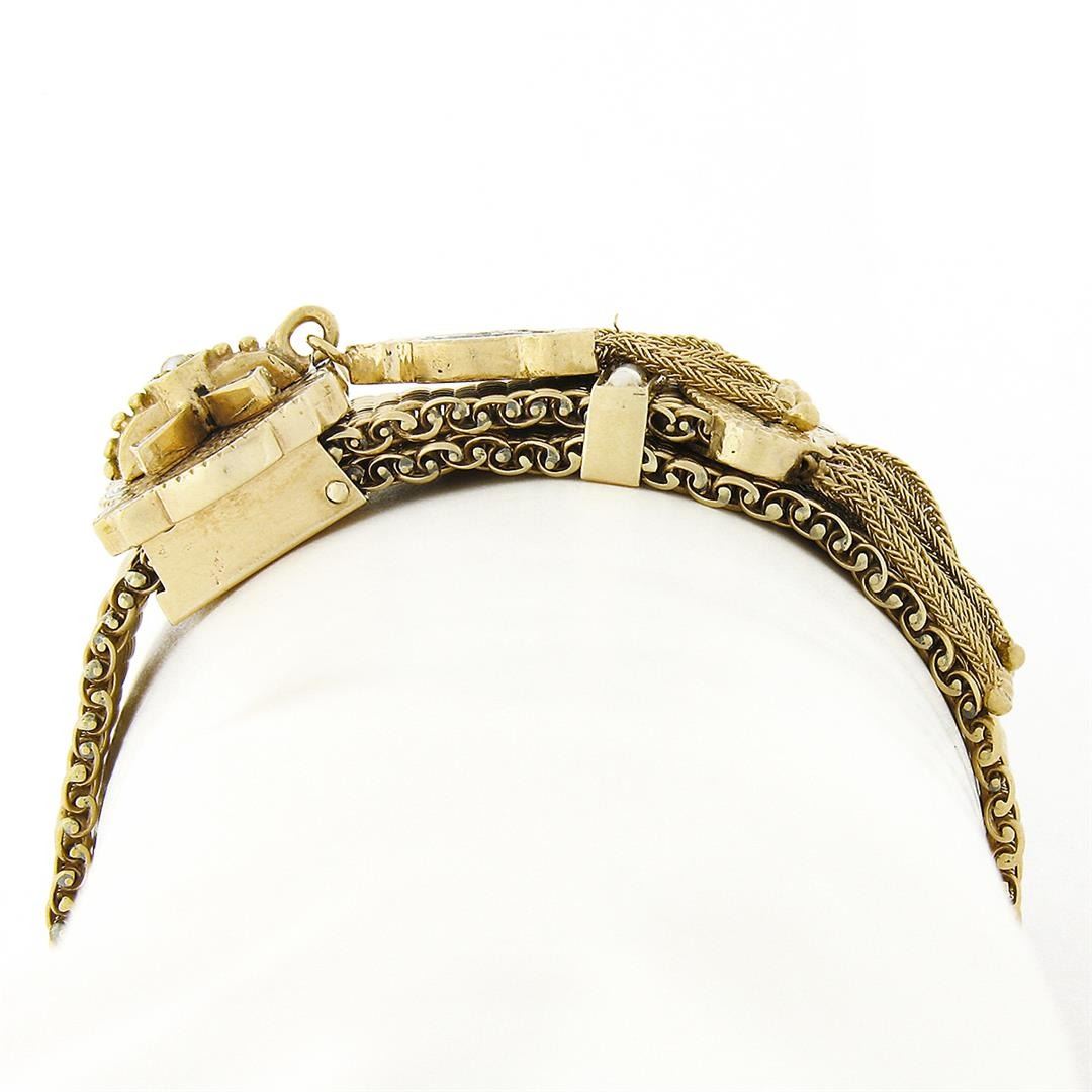 A solid 14k yellow gold tassel mesh bracelet. with 9 round shape cultured seed pearls (1.9-2mm). It weighs a total of 63.48 grams, measures 26mm wide, and measures 7.75 inches in length.