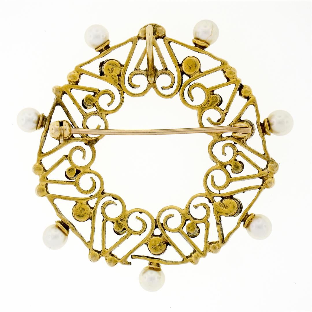 A vintage solid 14k yellow gold brooch pendant. with 7 round cabochon cut natural turquoise (2.40mm), and 7 round shape natural cultured pearls (2.75-4.0mm). Measures 41mm in diameter and weighs a total of 9.53 grams.